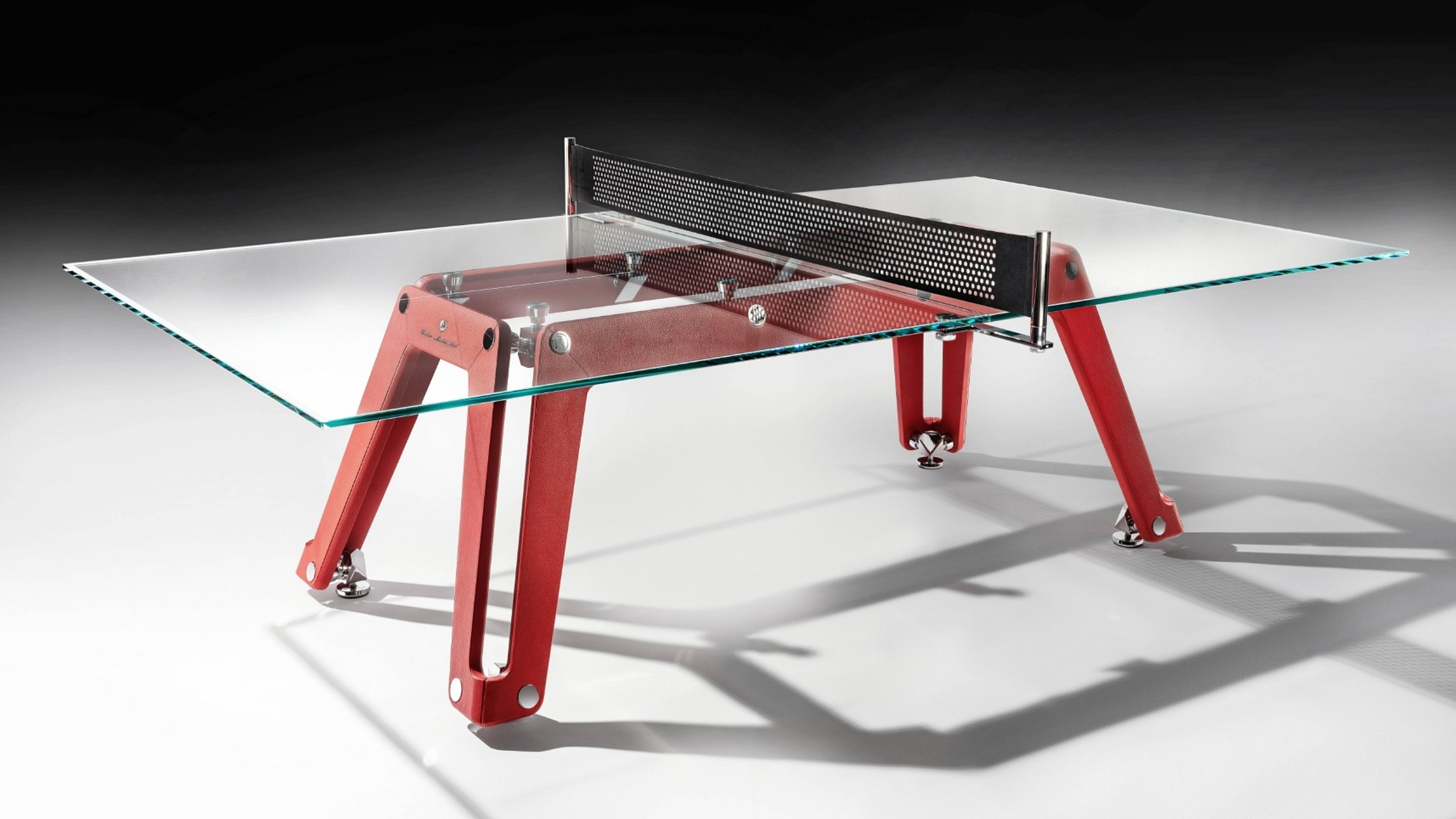 But the standout piece in this trio might be the “Lungolinea” ping pong table. With its leather-clad base, polished chrome components, laser-cut Alcantara net, glass top and Tonino Lamborghini red legs, the game room-elevating piece is worthy of a showing at Milan’s annual Salone del Mobile furniture show.
