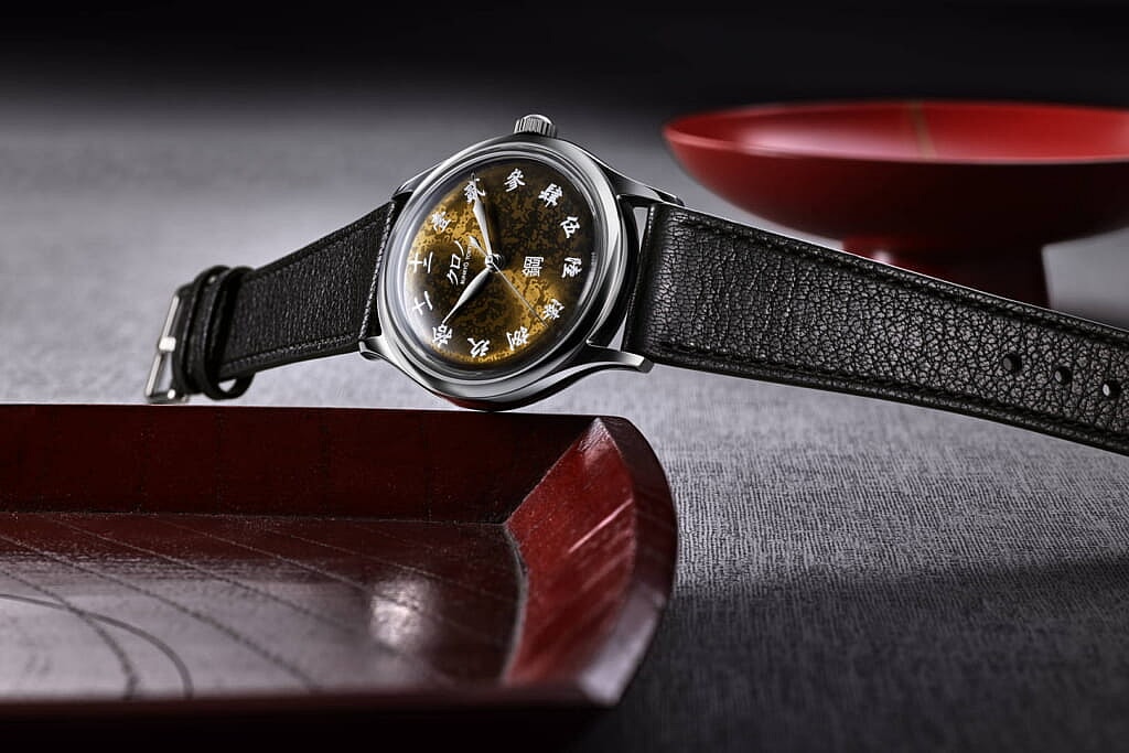 Meanwhile, a second lacquering called Roiro employs a chemical reaction between iron oxide and raw sap to create secondary blacks. The indices on the dial are rendered in ancient Koji, a written language still used for important documents to prevent plagiarism.