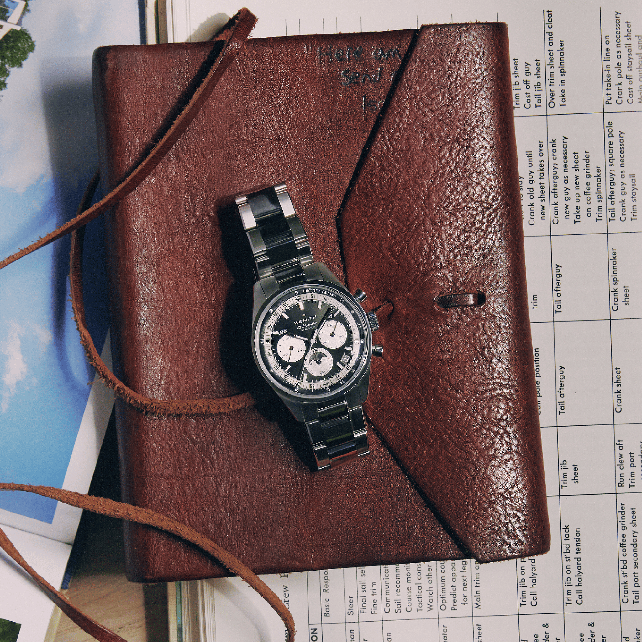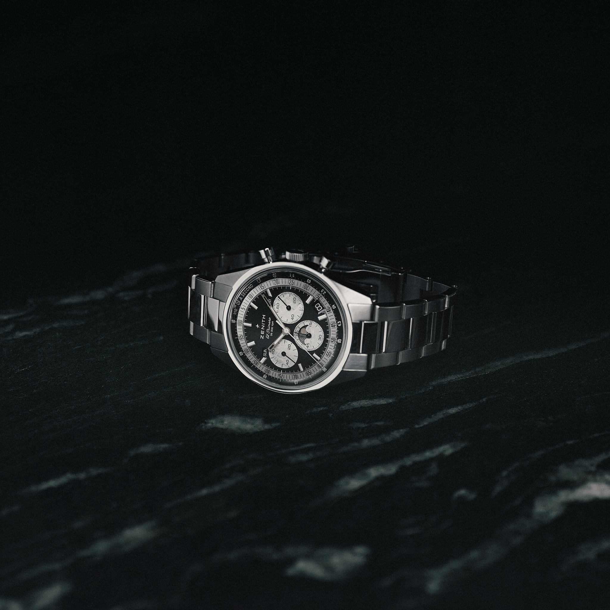 A more modern feature comes courtesy of the brand new El Primero Caliber 3610, released in 2024. Zenith upgraded its existing El Primero Caliber 3600 with the addition of a smoother calendar movement that shares the same high-beat rate and column-wheel design, maintaining Zenith’s signature 1/10th-second chronograph function. The watch also displays day, date and month beneath a sapphire crystal that’s fitted to a 38mm stainless steel case. Other key features include a 60-hour power reserve, 50 meters of water resistance, and the choice of either a black calfskin strap or a stainless steel bracelet.