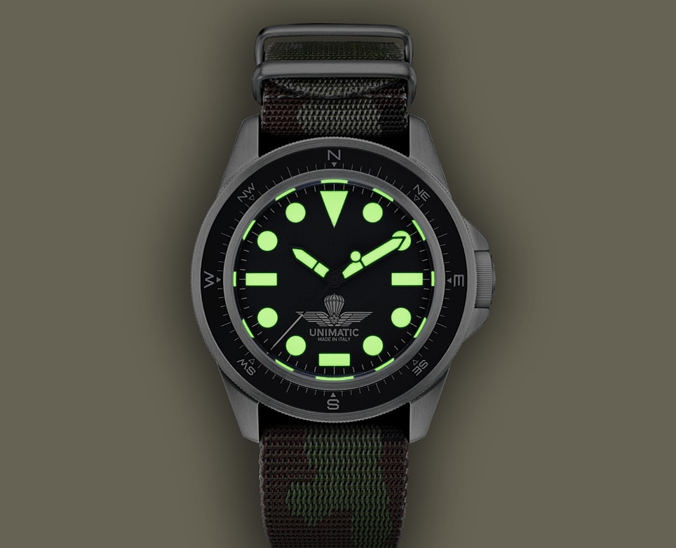 The UNIMATIC U1-PA pays tribute to Italian paratroopers, placing a paratroopers’ badge at the 6-o’clock marking while also incorporating a unique compass bezel, a first for the brand. It’s but one of a few carefully selected updates fit for the field from UNIMATIC.