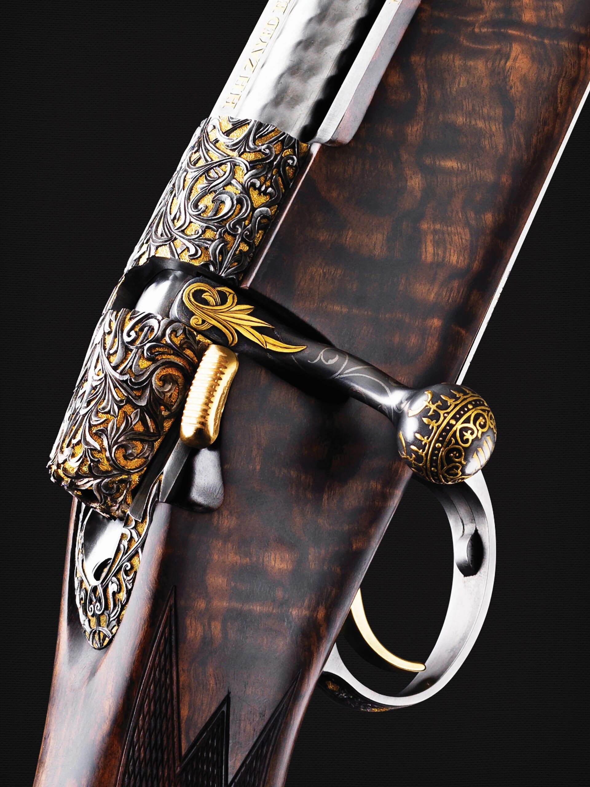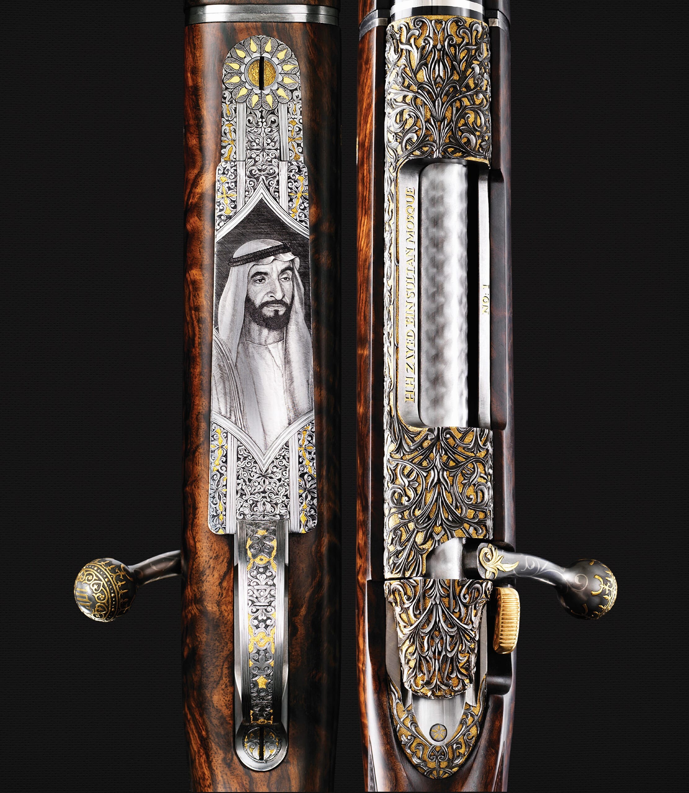 That certainly describes the VO Big Five Edition rifles with gold inlays designed as a tribute to Ernest Hemingway and the “big five” game animals (lion, leopard, buffalo, rhino and elephant) and the VO Falcon Rifle, designed to pay homage to hunting with falcons, a strong tradition in the Middle East. The engravings for the latter took more thank six months just to research, and the gun features bespoke parts crafted of Damascus steel.