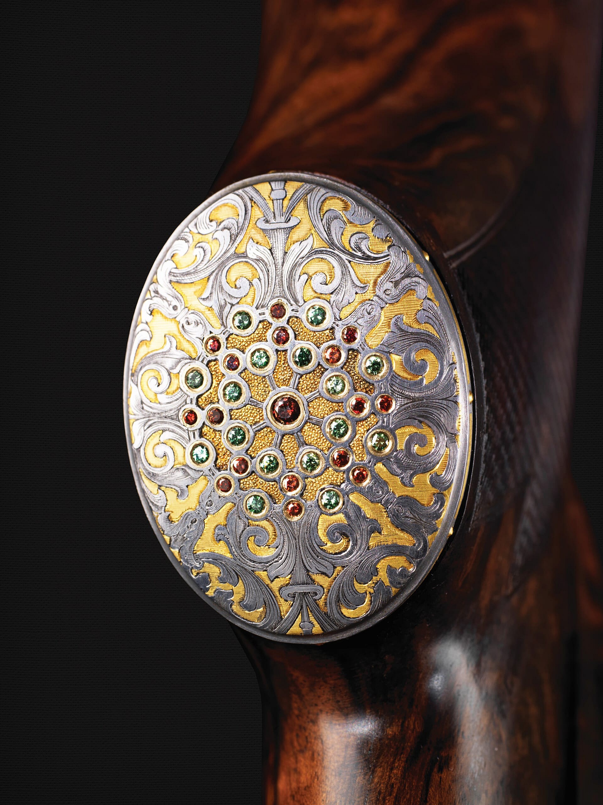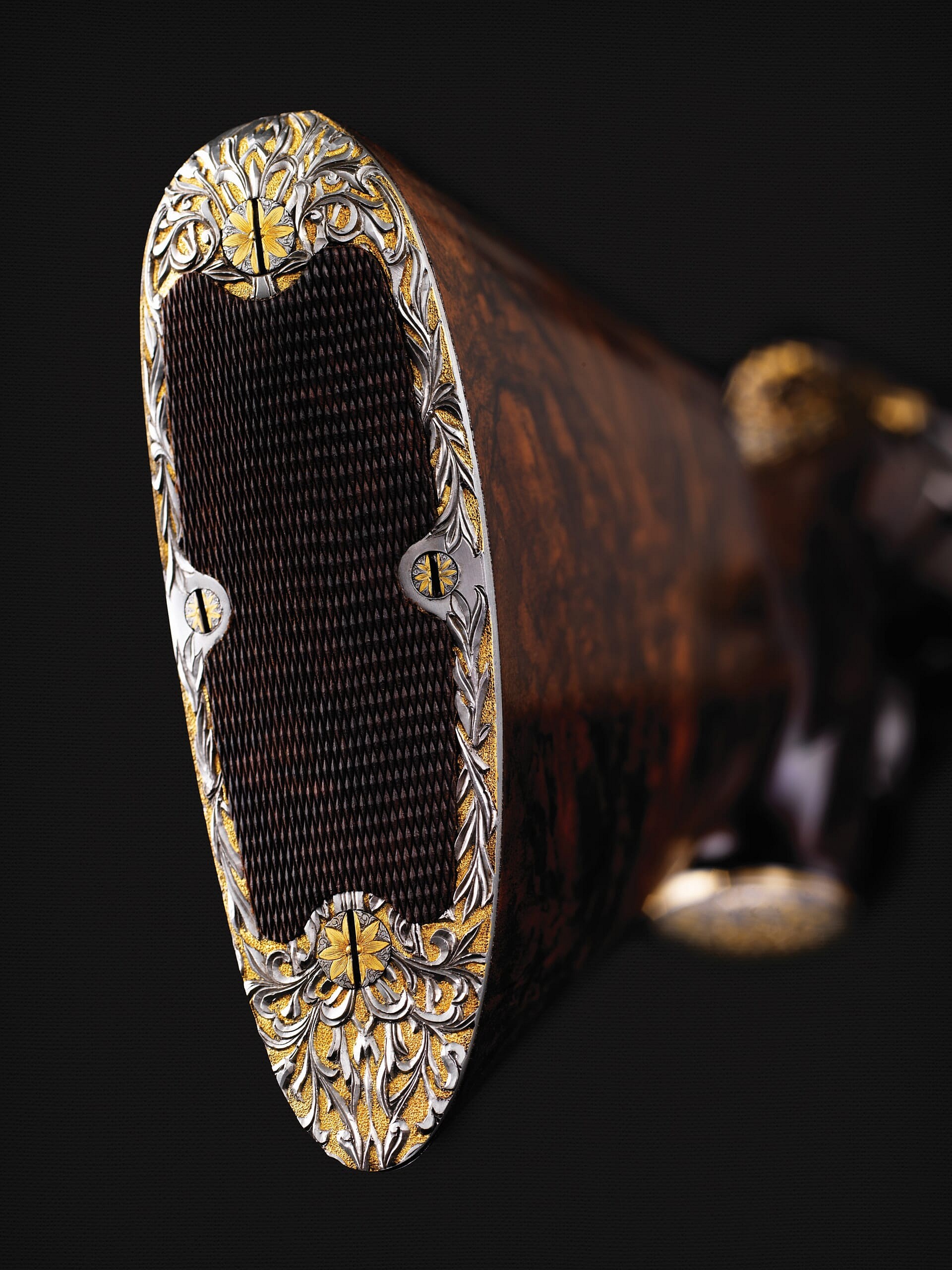 Gold and jewels adorn their most precious creations, while the engraving work is of startling elegance. The stocks are made of the finest walnut root, hand-selected and meticulously prepared by Olsson and his son Ulf, also a gunsmith.