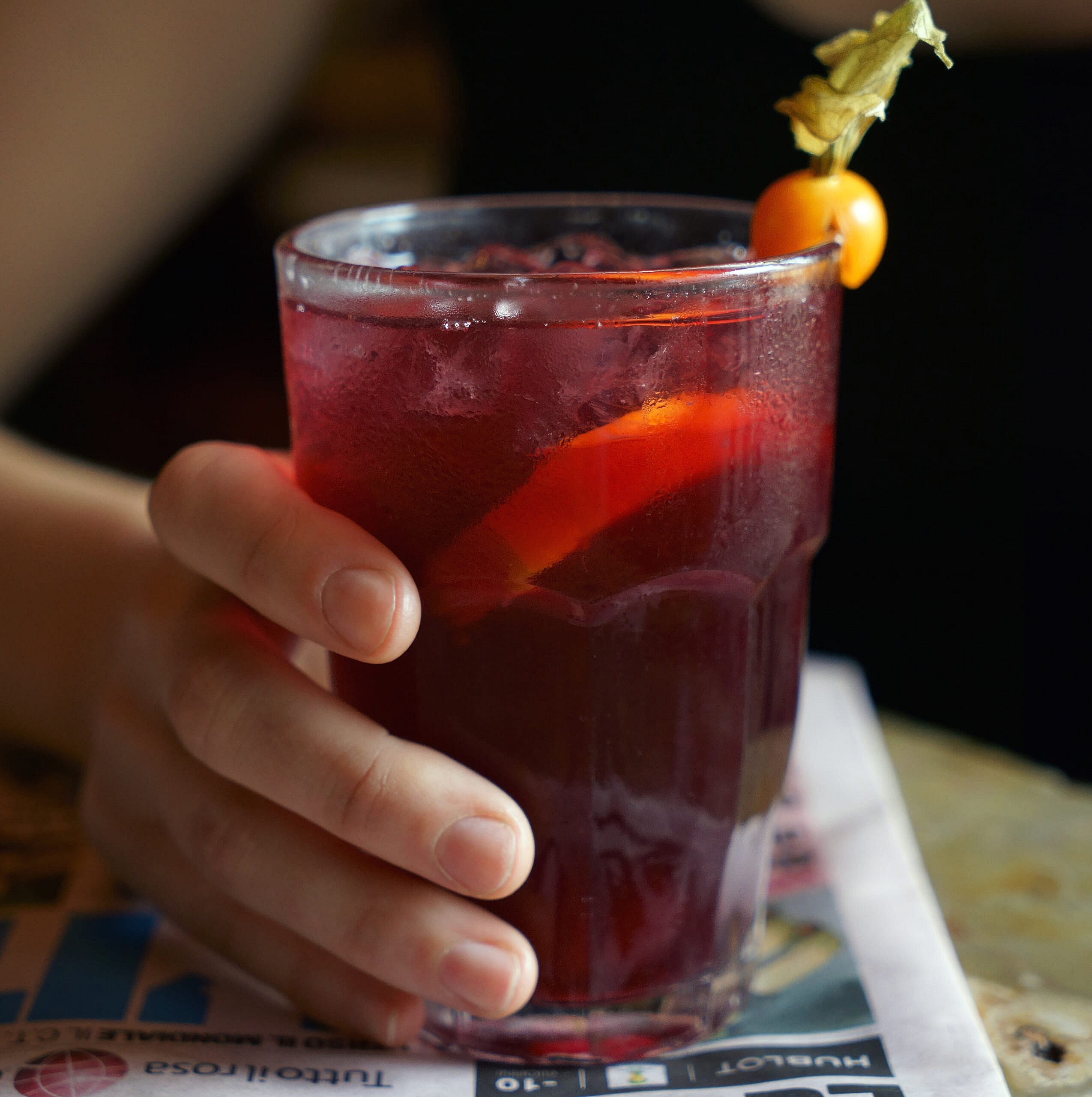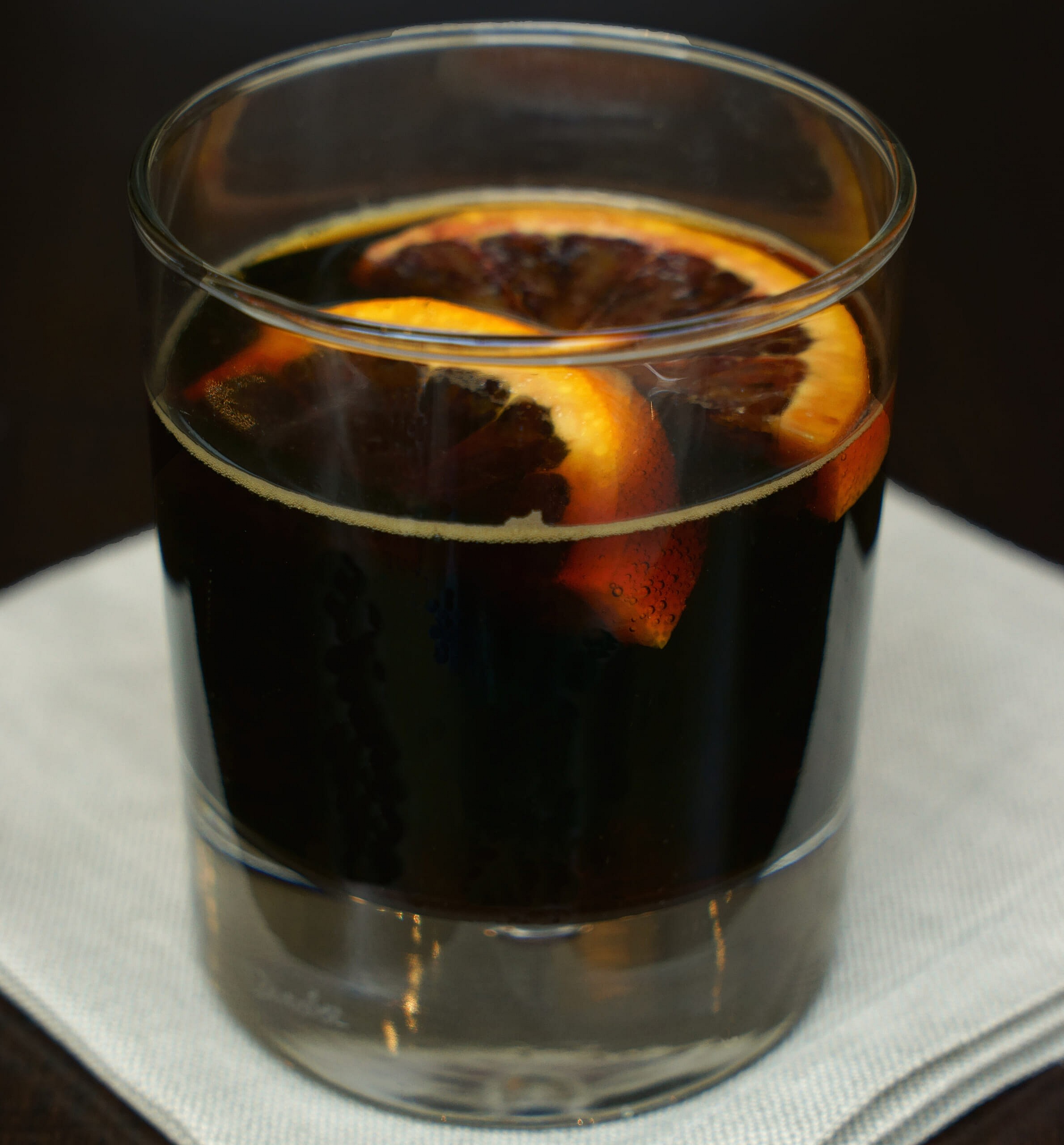 2 ounces dry red wine, preferably Barbera; 1 ounce Campari; 1 ounce Cedrata Tassoni or sparkling lemonade; slice of orange.