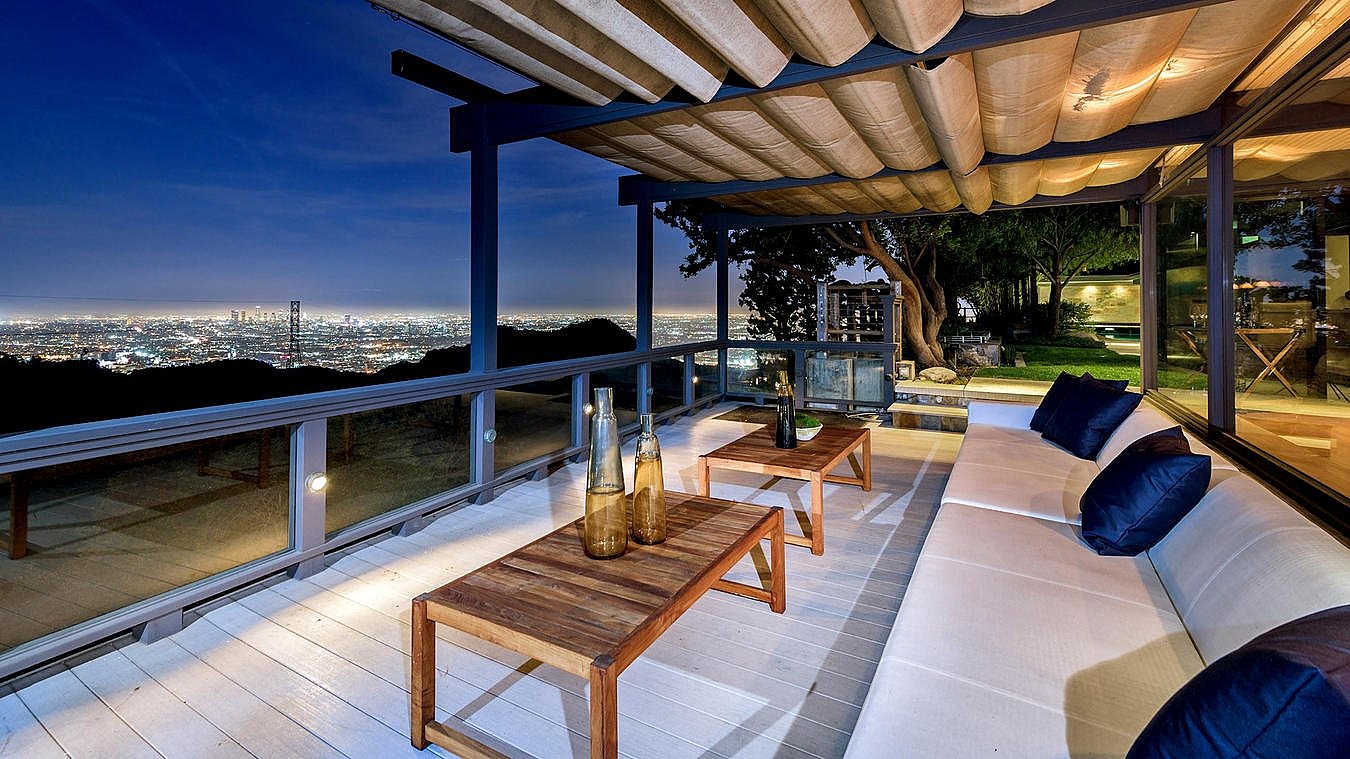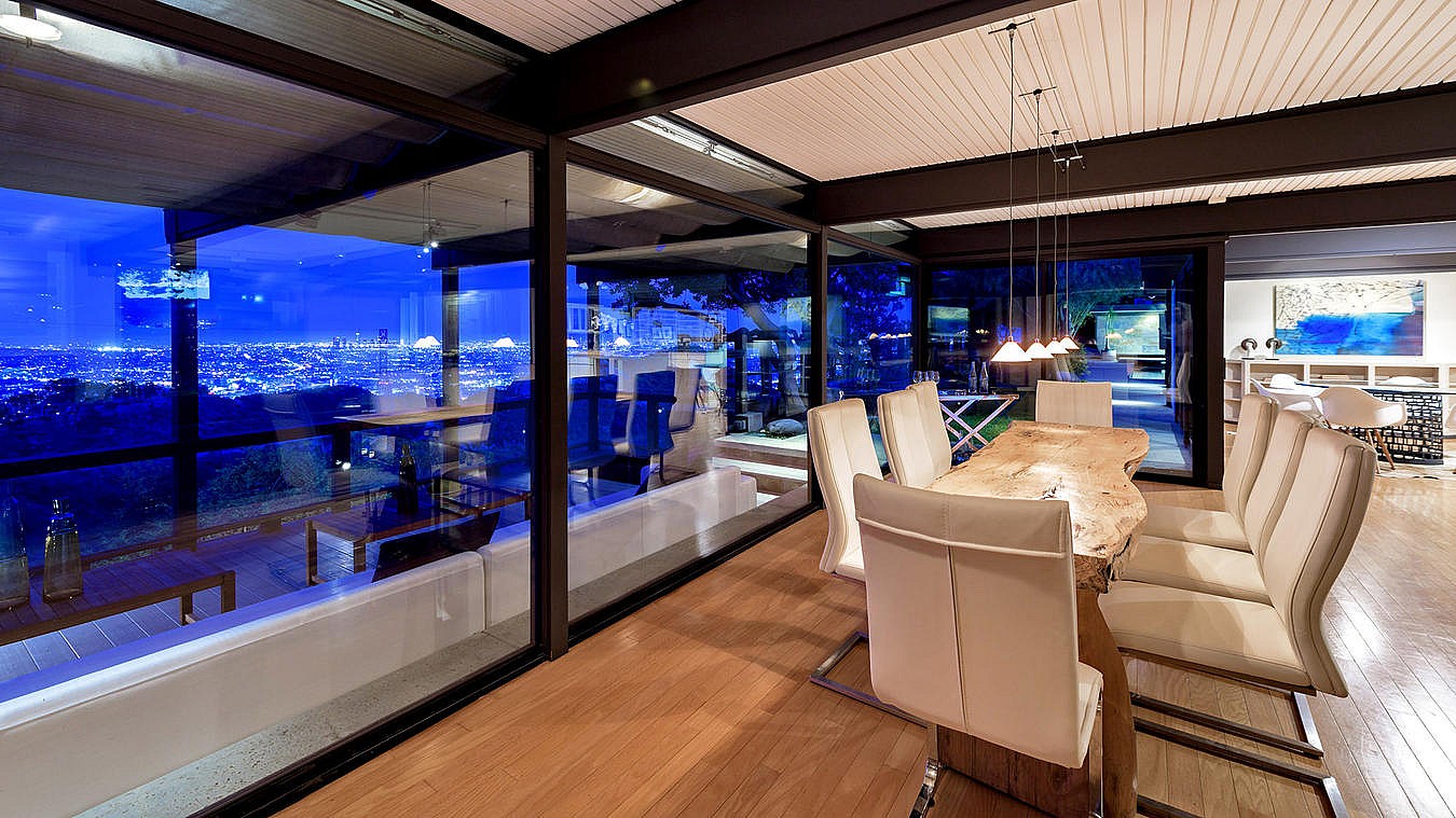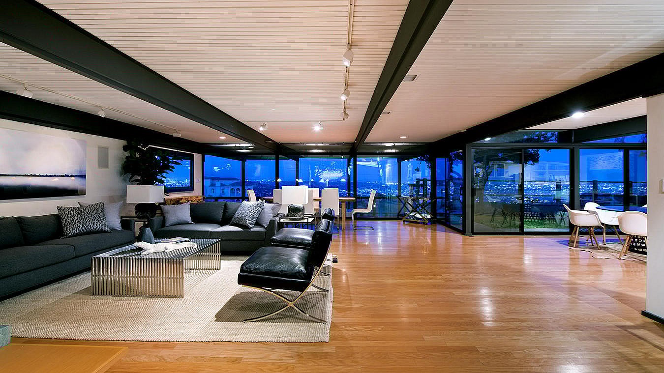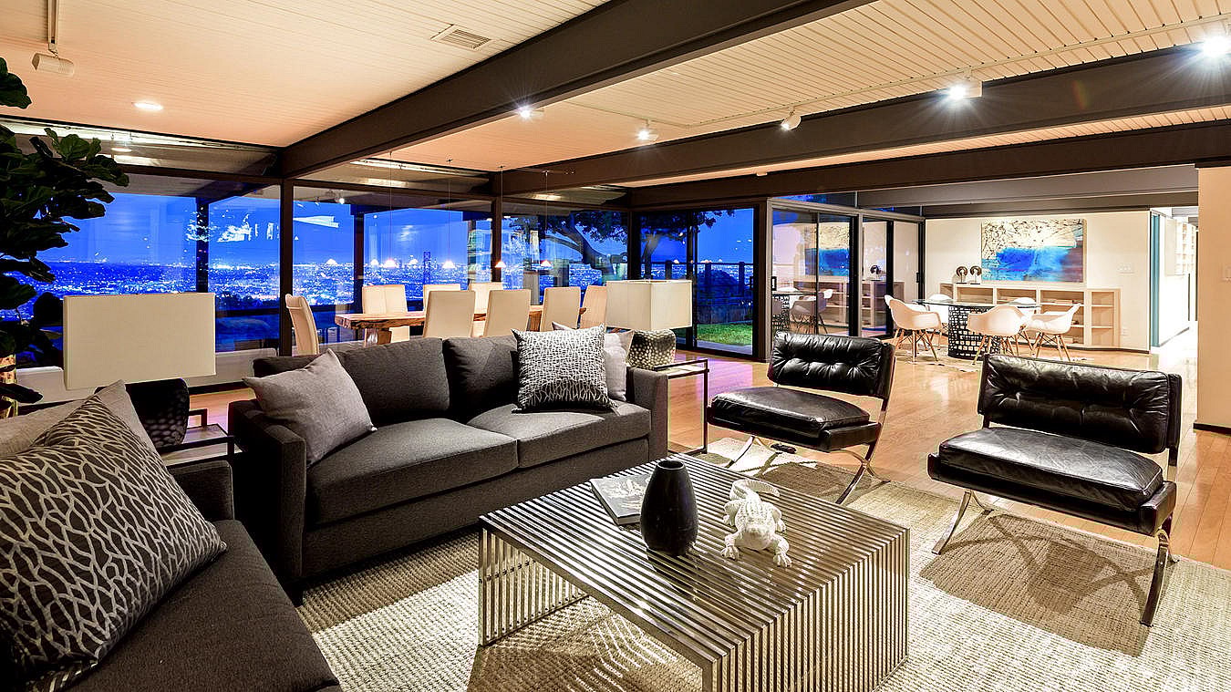 The house features an open-plan layout and walls of glass providing panoramic views of the L.A. cityscape and canyons. Ceiling beams emphasize the strong horizontal lines of the classic mid-century architecture.