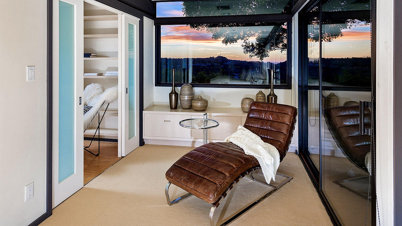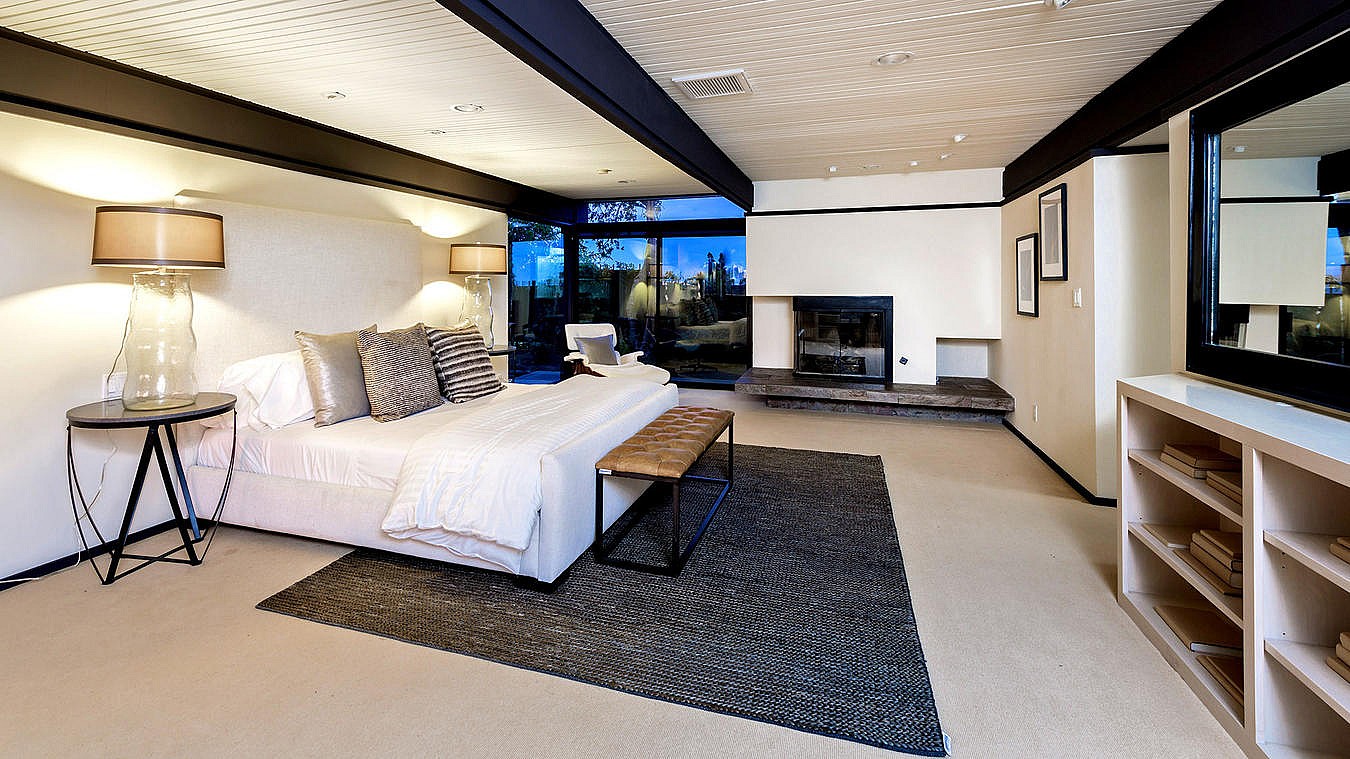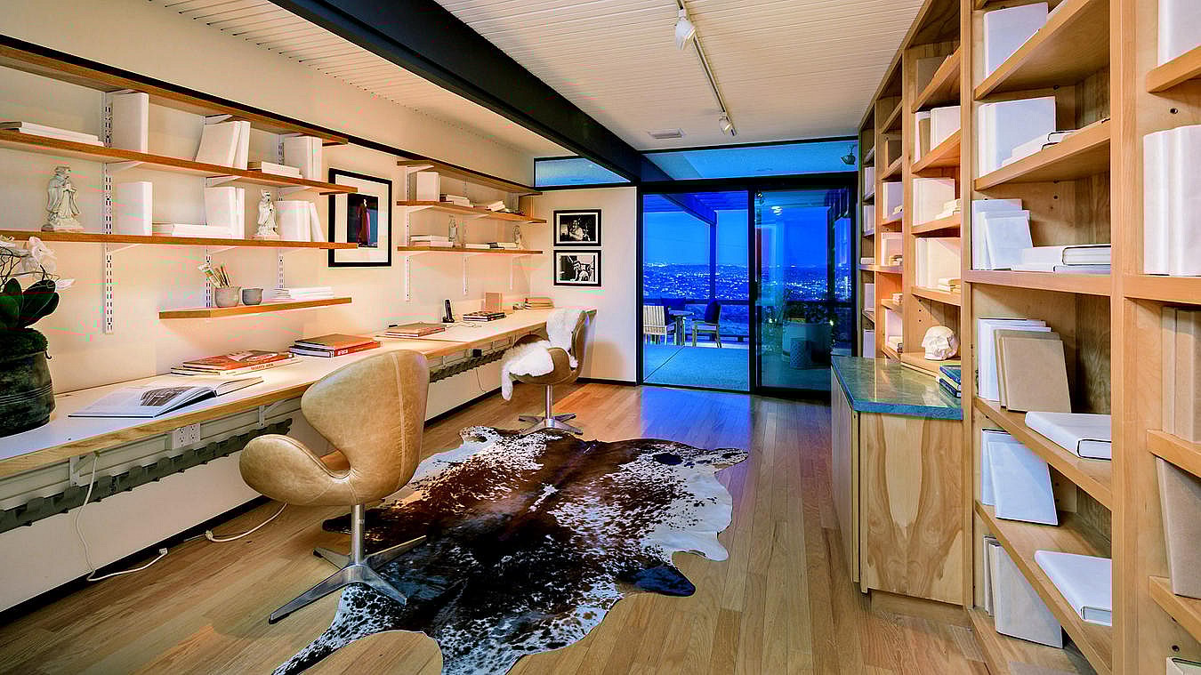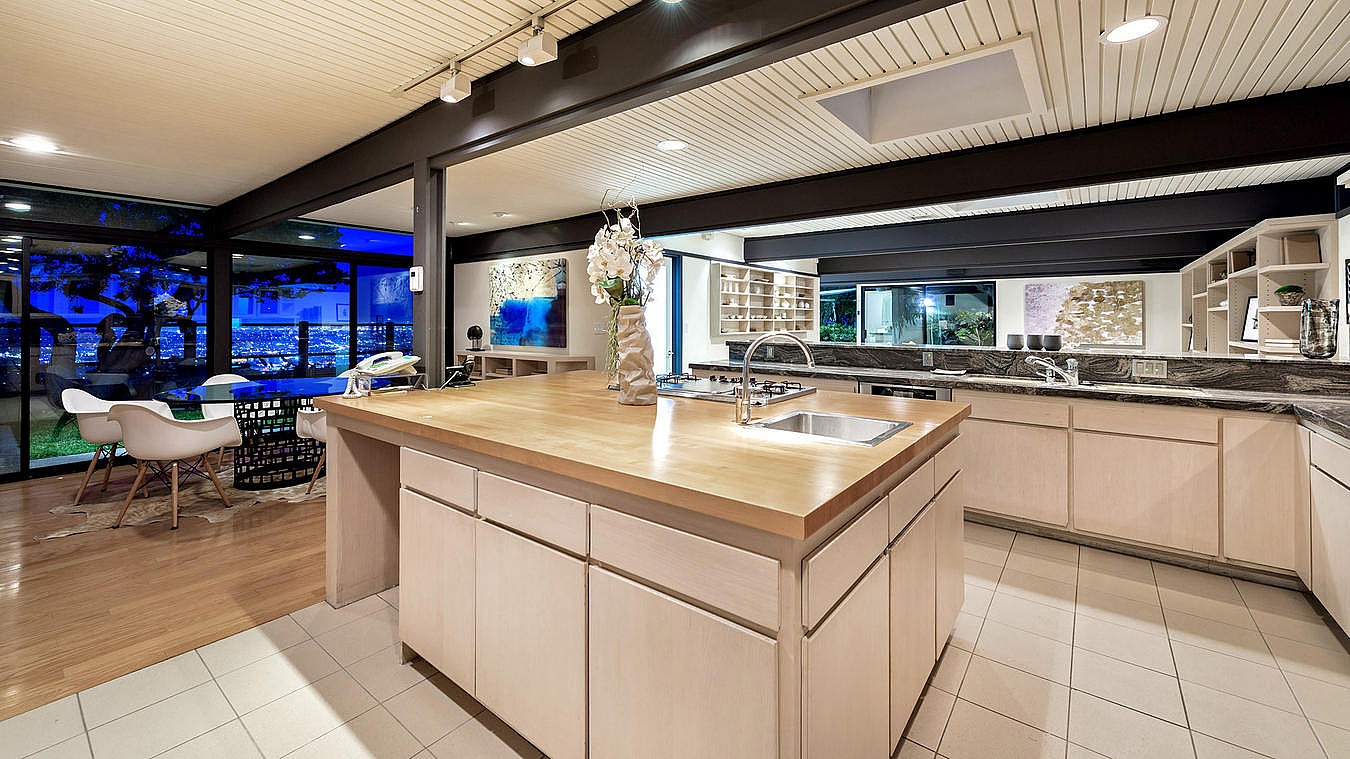 The house features an open-plan layout and walls of glass providing panoramic views of the L.A. cityscape and canyons. Ceiling beams emphasize the strong horizontal lines of the classic mid-century architecture.