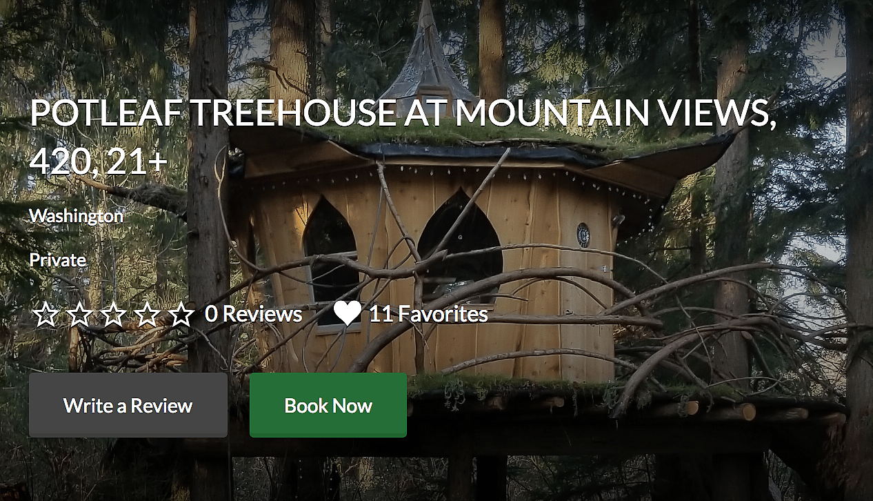 “If youre looking for something out of a Mother Goose fairytale sung by Bob Marley, we are pleased to unveil PotLeaf Treehouse. A cozy cabin in the trees that sleeps 2…Be sure to celebrate all the property has to offer with the horse and donkey, two dogs, and stylish mini-pig.”