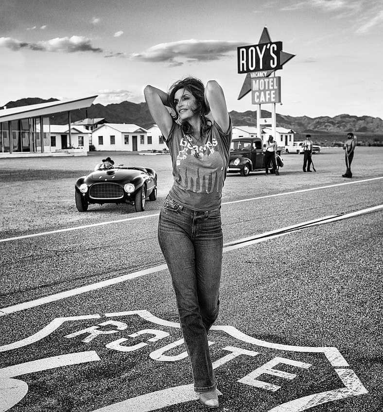 Since 2018, Crawford and Yarrow have teamed up on several cinematic projects, with all of the proceeds going toward philanthropic causes. Collectively, they’ve raised over six million dollars for the American Family Children’s Hospital. “Each shoot has been thoughtful and unique,” Crawford wrote in the forward to Yarrow’s book, Storytelling. “David doesn’t call until he’s personally excited about his next idea for me. He makes it such a pleasant and fun experience that it’s always easy to say yes.” We’re glad she does. Some of the best shoots recreate famous moments in American pop culture, like the crop-duster chase scene from Alfred Hitchcock’s North by Northwest. In that image, featured on this issue’s cover, Crawford took the Cary Grant role, posing in a rare 1953 Ferrari 250 MM Vignale Spyder while a plane swoops down low behind her. “The premise was to style the set as if we were indeed in the late 1950s, and we recognized that we had a strong backdrop, as Roy’s Cafe is one of the treasure trove authentic landmarks of Route 66,” Yarrow explained. The shoot required a bit of stunt work, but it was nothing veteran pilot Greg Caldwell couldn’t handle. “There didn’t seem much to trouble Greg—not even his plane’s aerial proximity to a $10 million Ferrari or, more importantly, one of the world’s most identifiable and revered women,” Yarrow said.