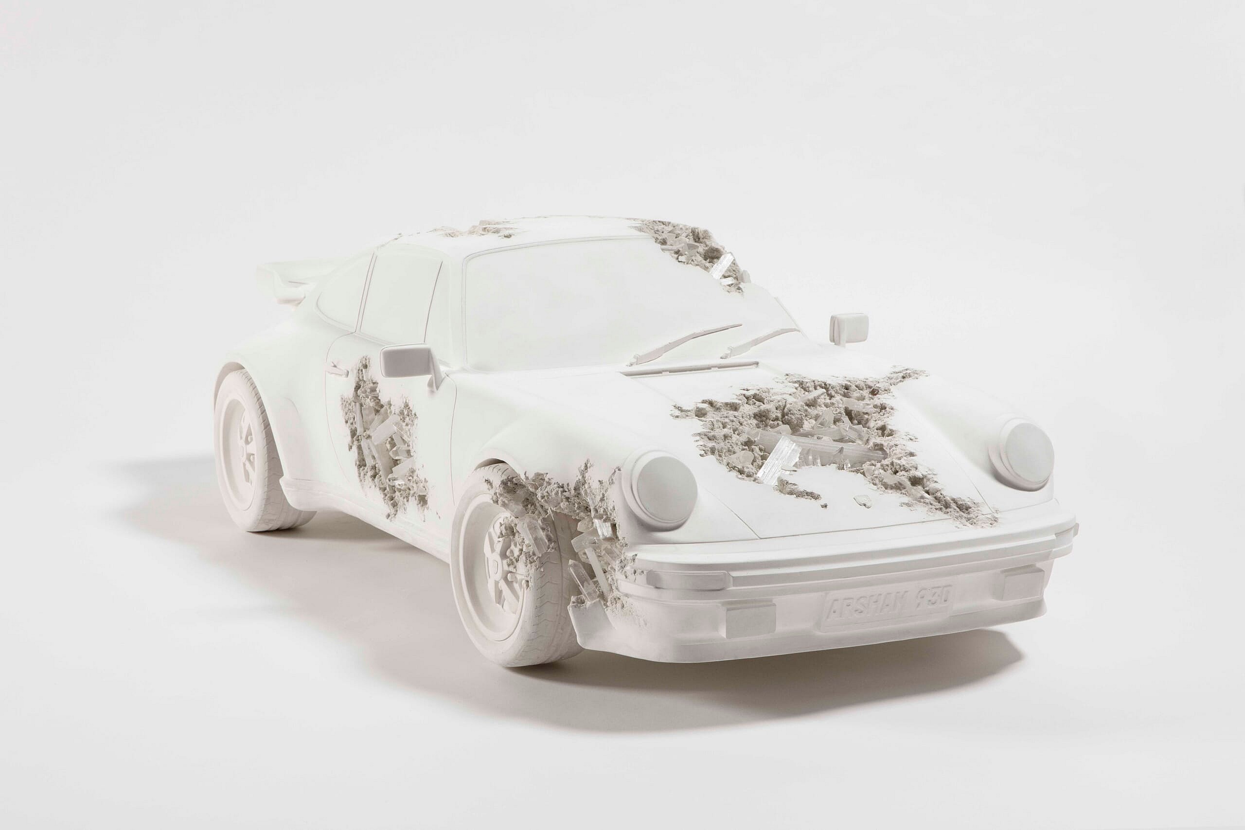Arsham started exploring cars a few years ago. Last Fall, he presented a show centered around the subject matter, cast with crazy detail at a 1:3 ratio, with Library Street Collective in Detroit—whose gallery was designed by Arsham’s firm Snarkitecture. Arsham said the Eroded Ferrari with selenite was the most challenging to make, since its drop top shows the full interior. “It’s composed of 35 pieces that all had to be cast individually and then assembled,” he said.