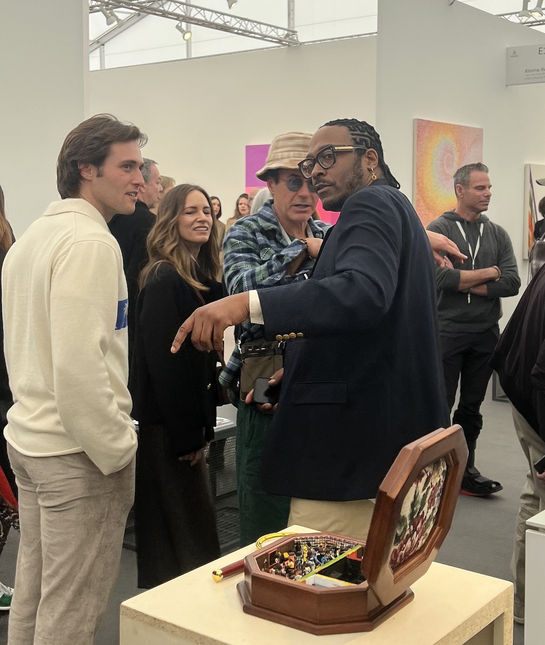 Pioneering powerbroker Tina Kim is sharing an extensive array of works from her notably intellectual roster all weekend. Disparate artistic approaches harmonize on the common ground of mesmerizing patterns. Jennifer Tee has a solo show at Tina Kim New York right now, and one of her works in Tina Kim’s Frieze L.A. booth features a series of tulip petal collages, which she scans and rearranges into the blueprints of big transatlantic ships.