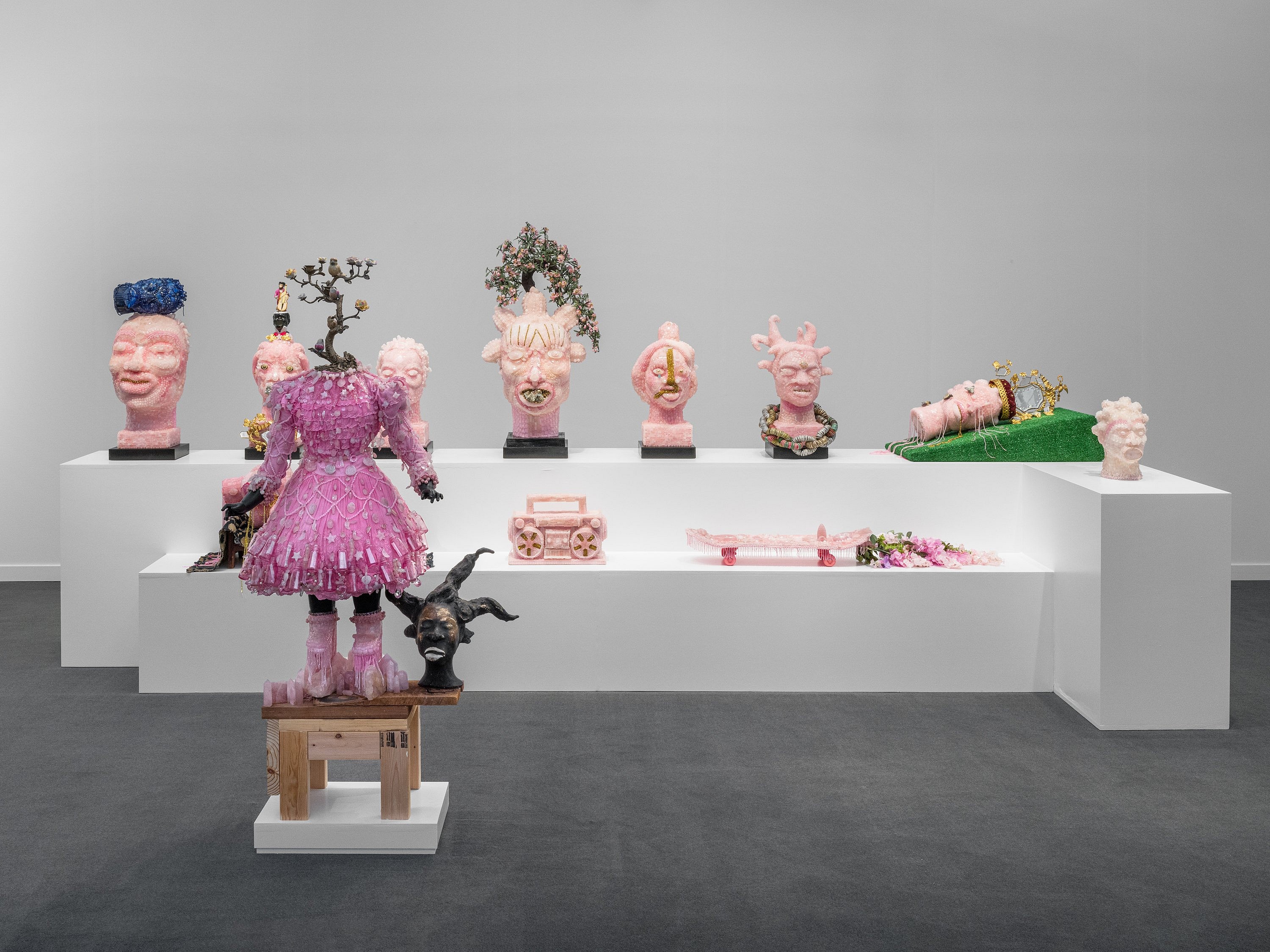 Frieze L.A., however, debuts German’s latest experiments in sweet, scintillating rose quartz. She conceptualized the whole series, in fact, for this very event. The forms themselves range from busts to skateboards and even a machine gun, altogether honoring her hometown’s hip-hop history while casting the Black community’s cultural contributions in new, complex, and loving lights. She’s recorded prayers to accompany certain sculptures on-view, available to hear on request.