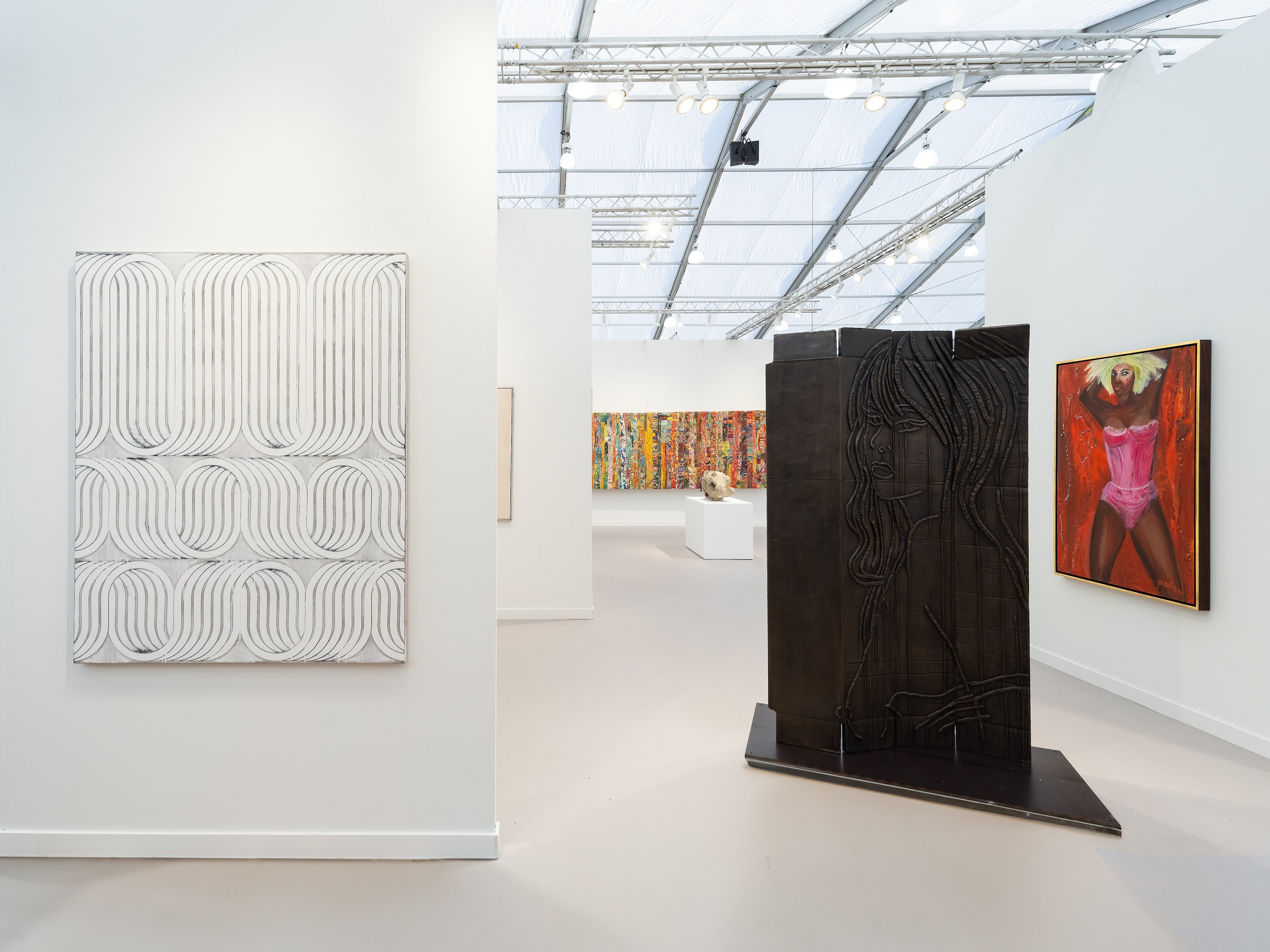 A psychedelic, mixed-media trapunto painting by Pacita Abad highlights Tee’s earthy hues. Sculptures punctuate the full mix, from a compact example of Mire Lee’s body horror to a tall, dark, bronze screen by Ghada Amer that’s embossed with a topless beauty that’s seemingly straight from a European porn zine.