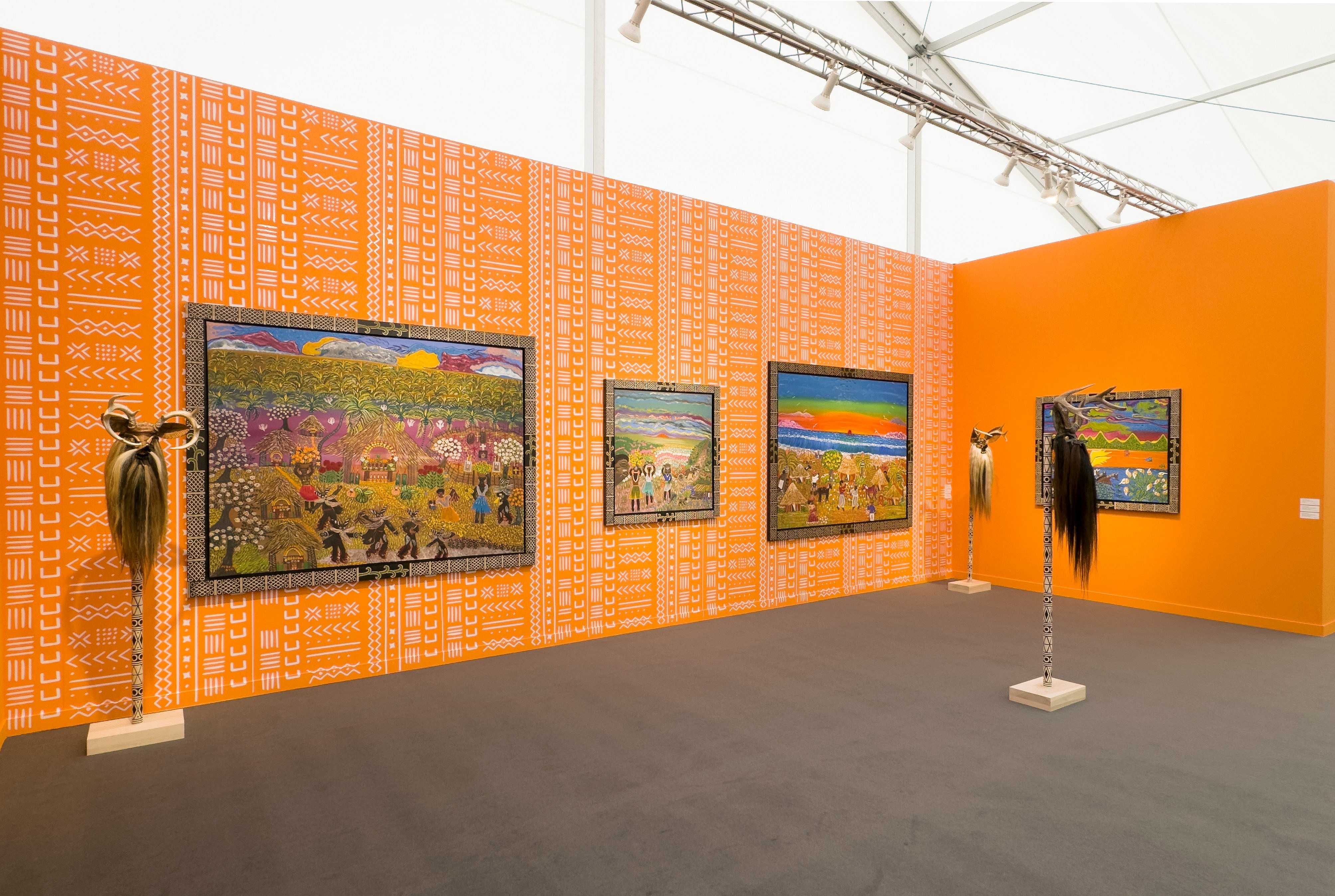 Eye-catching tangerine walls both complement the art and attract viewers into Mexico City-based Proyectos Monclova’s presentation of Mexican artists Aydeé Rodríguez López and David Montaño Roque. López’s works of oil on canvas, each mounted on hand-carved, dyed poplar wood frames, honor the legacies of Afro-Mexican laborers and the strife of the Spanish Conquest.