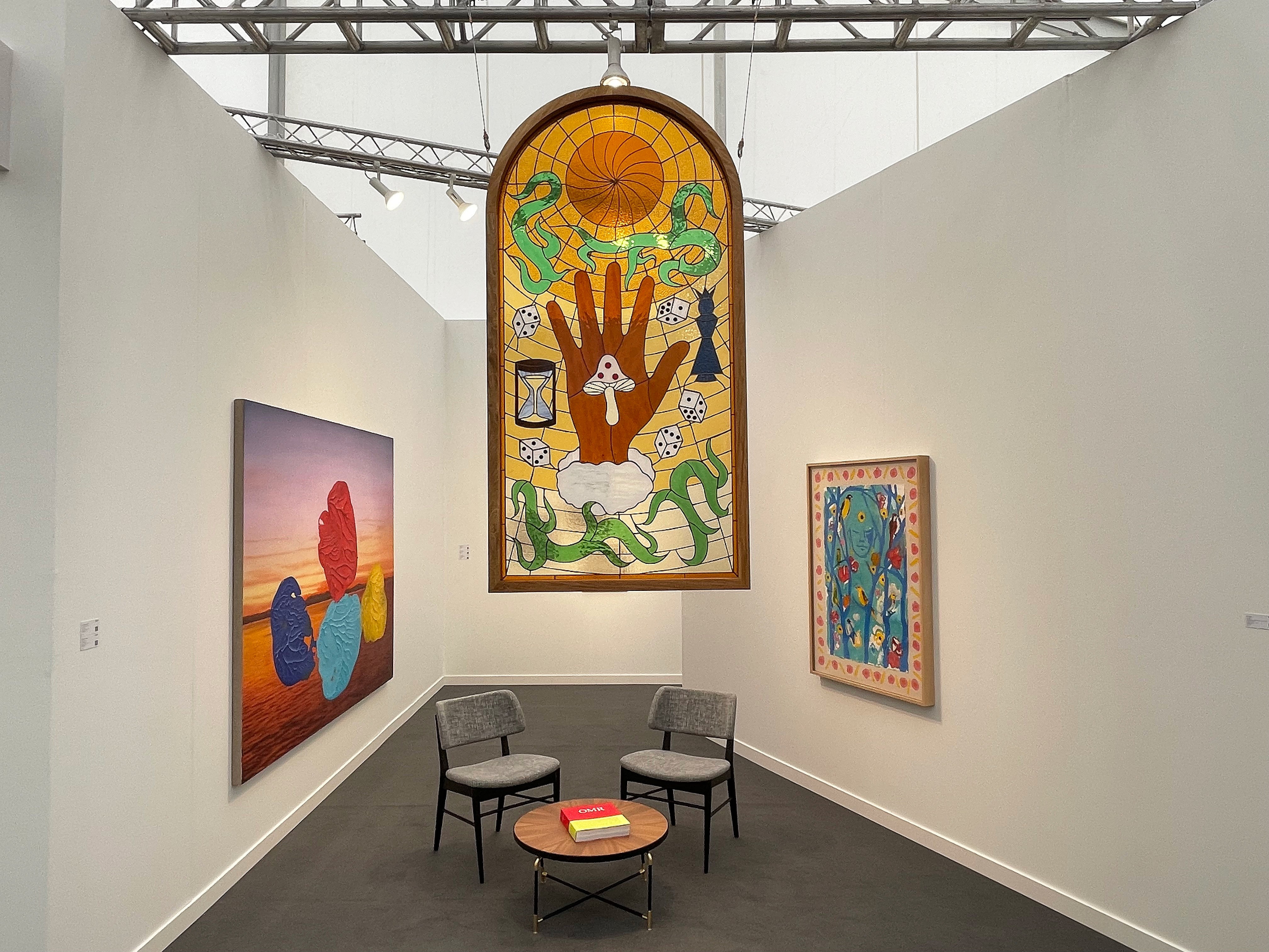 The varied efforts of Eduardo Sarabia, however, carry the showcase, imbuing archetypal craft techniques like stained glass, ceramic tile, and classic oil painting with contemporary iconography like dice and mirror pics rife with mysticism and sex appeal. Two vivid babes drawn by buzzy artist Simon Fujiwara hail from his ongoing Who The Baer series. Their buxom forms recall a Ganguin fetish for Tahiti against the booth’s opposite wall.