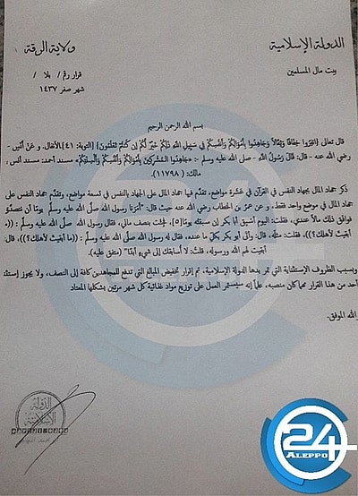 The memo seems legit, says Amarnath Amarasingham, a fellow at the George Washington University Program on Extremism. “It was shared by the Aleppo News Service, and I asked a few fighters and supporters about it, and they’re basically saying it’s because of the airstrikes of some of the revenue-producing sites and the banks that were targeted,” he says.