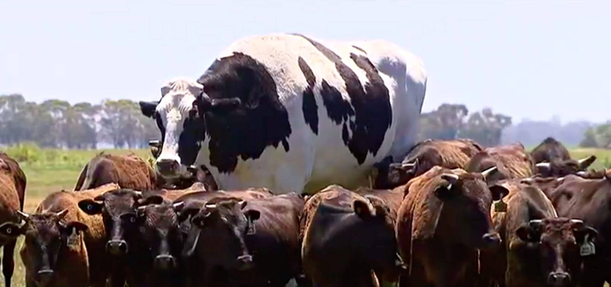 But according to Australian news outlet ABC, this bovine behemoth is “almost as tall as NBA star Michael Jordan and weighs more than a Mini Cooper,” standing at 6’4″ and tipping the scales at a staggering 1.4 tons. That’s udderly absurd.