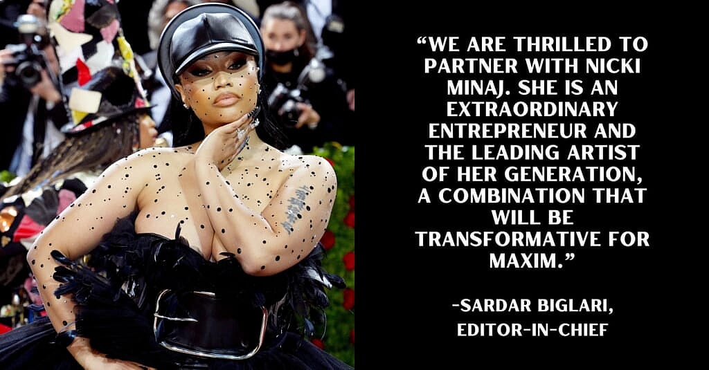 “We are thrilled to partner with Nicki Minaj. She is an extraordinary entrepreneur and the leading artist of her generation, a combination that will be transformative for Maxim,” said Sardar Biglari, editor-in-chief of Maxim.