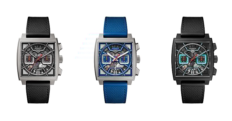 The watch trio, which launched ahead of the 80th anniversary of the iconic race on Sunday, embraces a bold shot of color while also breaking new ground by using a skeleton dial in the Monaco for the first time.