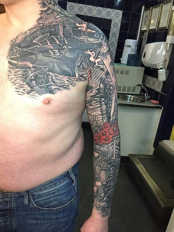 Over those 30 long, agonizing hours, Boston transfigured the thick lines of his played-out tribal tattoo into a seriously badass memorial honoring the fallen British soldiers of World War I and World War II.
