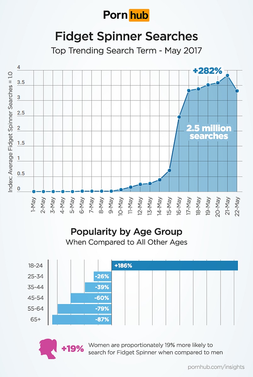 According to Pornhub,“fidget spinner” was the top-trending search term in May, with over 2.5 million searches in just 10 days, and at its peak, searches for fidget spinner porn was up 282 percent.