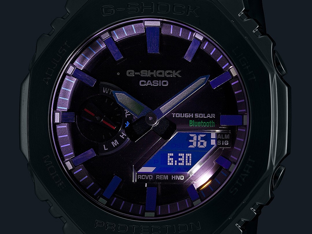 The GMB2100PC-1A is a fitting tribute to the G-SHOCK legacy, with functional details like a high-brightness double LED light, 200-meter water resistance, solar power, 1/100th-second stopwatch and modern connectivity, giving the wearer the option to display world time in up to 300 cities through the CASIO Watches app.