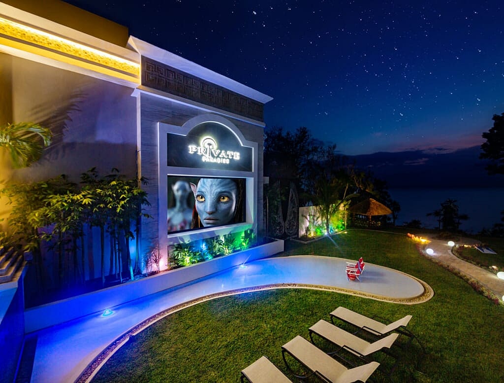 It’s like living in Bruce Wayne’s Mansion with hi-tech equipment all around you, including a 16-foot theater screen that descends over an ocean-front glass wall in the great room and Dolby DTS surround sound coming from everywhere. Grand opening guest Paul Barker described it as “Mission Impossible meets 007” in his Trip Advisor review.