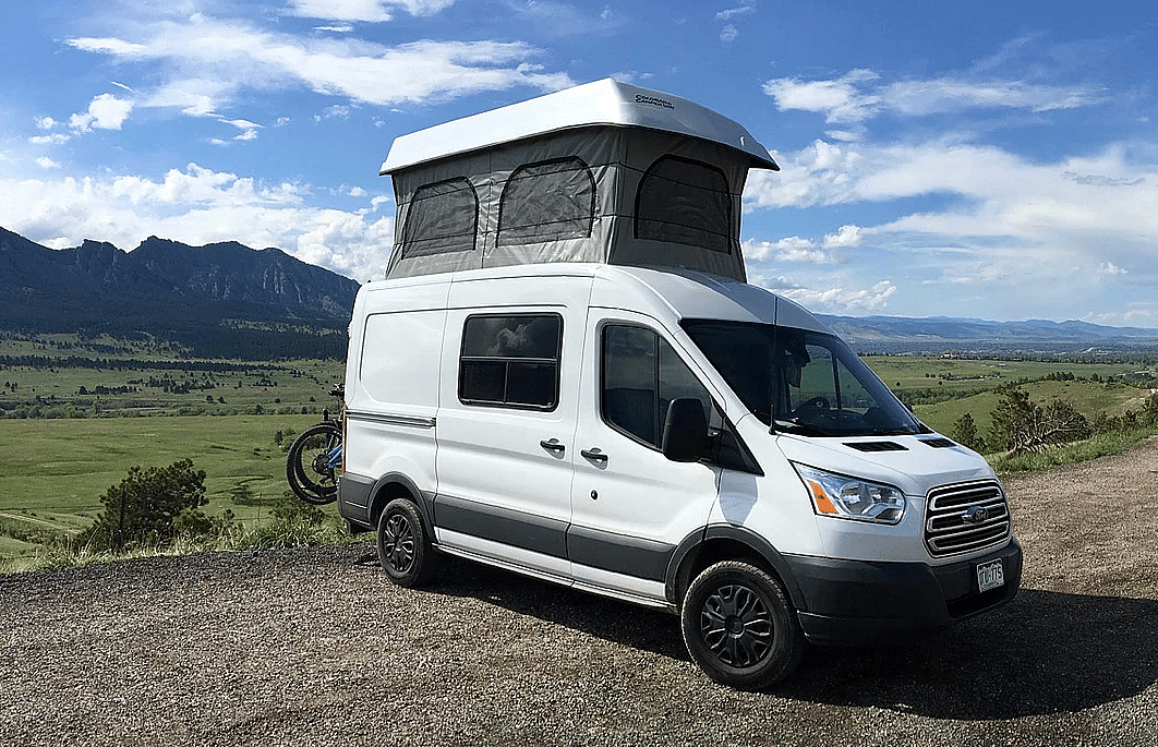 Ford’s Transit seems destined to become a favorite for #vanlife-ers, but its lack of four-wheel drive will limit its utility as an adventure van. Still, Colorado Camper Van’s massive pop up roof makes the Transit seem nearly as spacious as a motorhome, so it might be a good call for families with kids who don’t need to get too far into the outback.