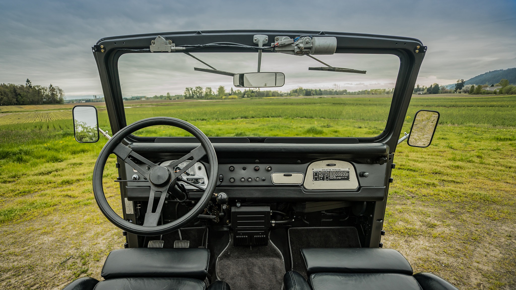 Behind the Bestop soft-top and brand new doors is a three-spoke steering wheel, factory gauge cluster, modern Recaro-style sport seats and custom marine carpeting. Inside and out, the classic off-roader is clean as can be.