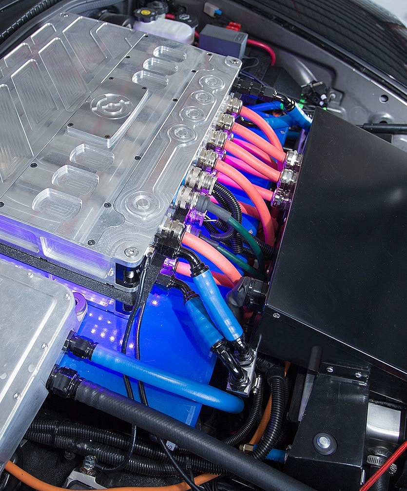 An up-close inspection of the car reveals not only impressive craftsmanship, but also a bit of showmanship, as the car’s underhood electric components enjoy dramatic blue lighting to ensure viewers comprehend this Corvette’s exotic propulsion source. It makes the flux capacitor in Doc Brown‘s DeLorean look like a Playskool toy by comparison.