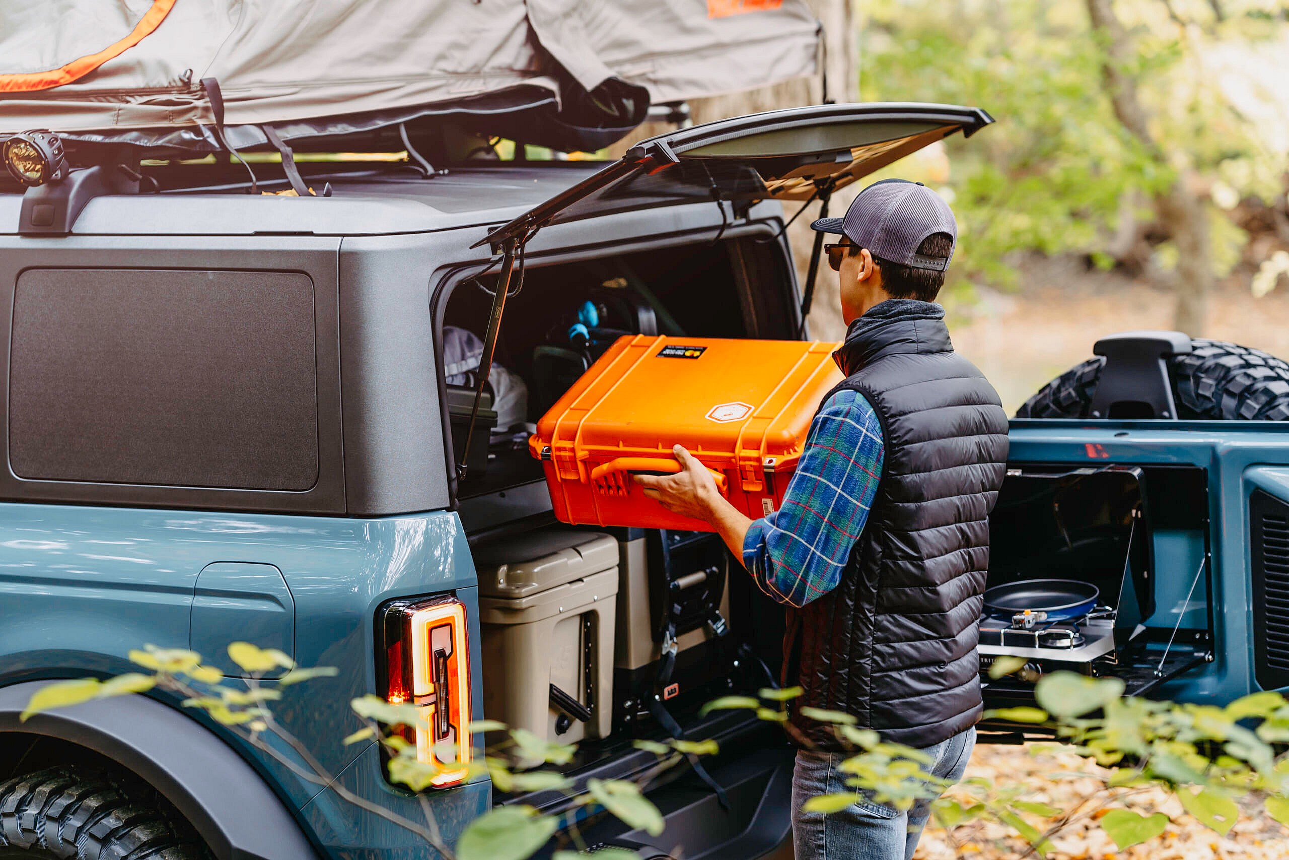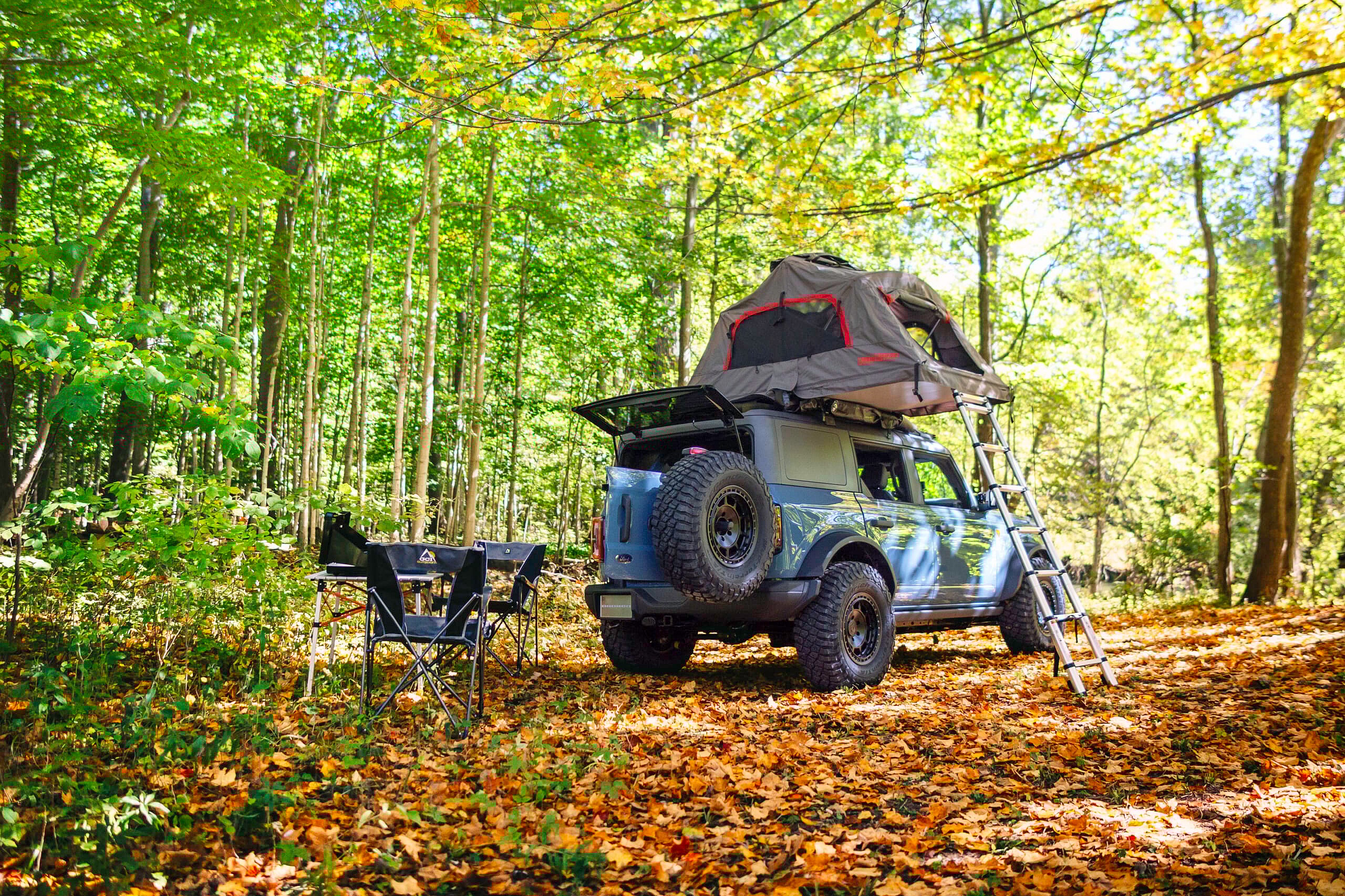 A rugged roof-mounted tent and a rear cargo area equipped with an outdoor kitchen are built for off-road excursions.