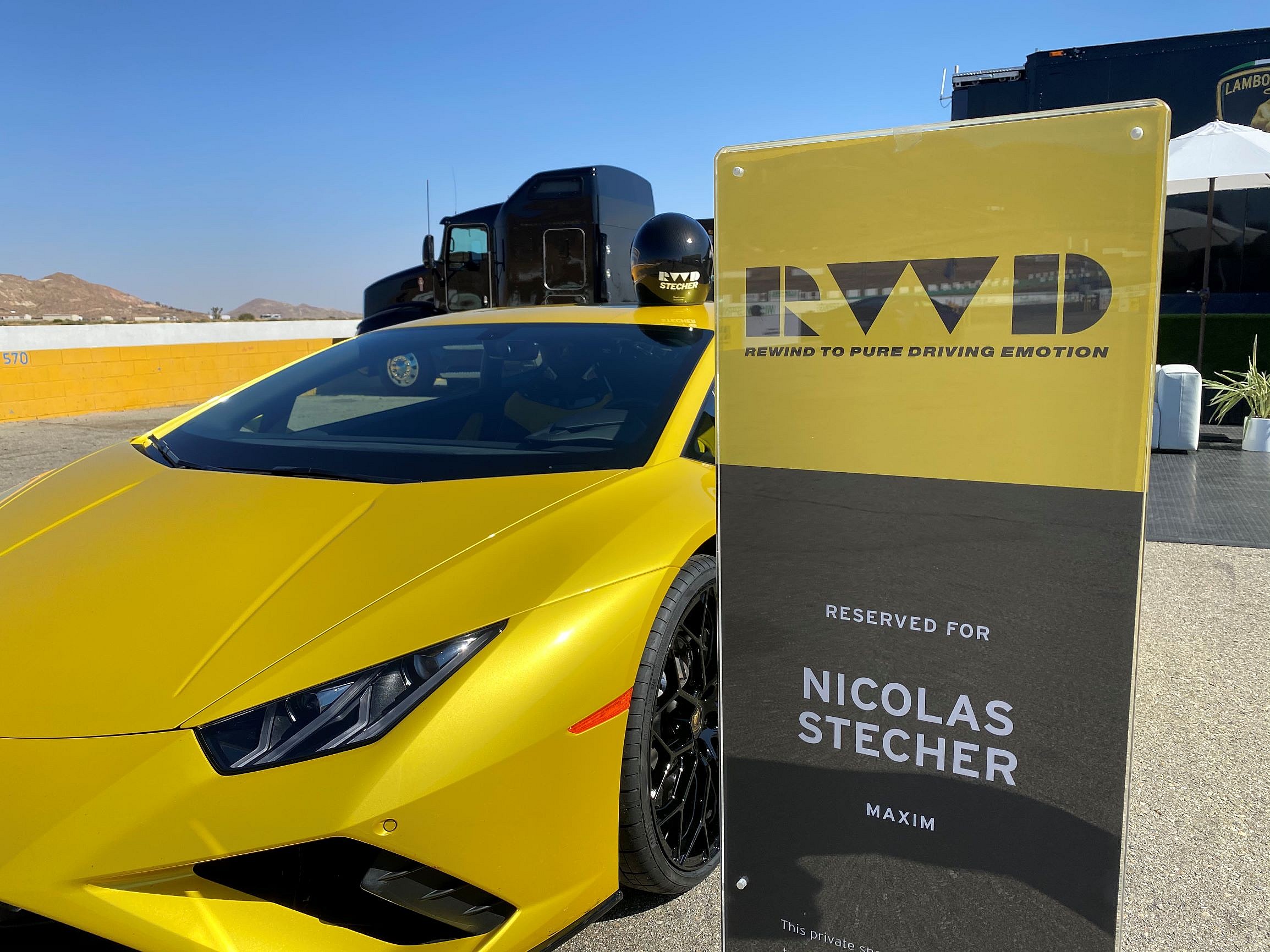 But soon we come to the realization the measures Lamborghini have taken on this international first-drive are long and cautious, including staggering waves so only two journalists are at Willow Springs at the same time — each on different events at different corners of this gigantic desert campus. When I walk up to my awaiting canary-yellow EVO Coupé, I notice they’ve even gone so far as to supply us with our own personalized carbon fiber Snell helmets. How considerate.
