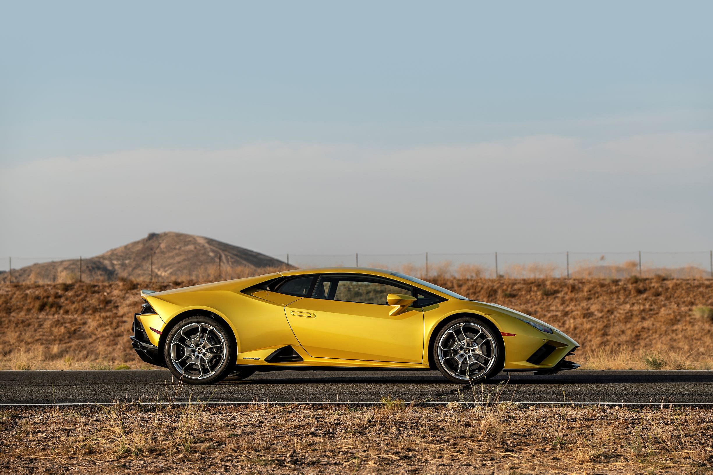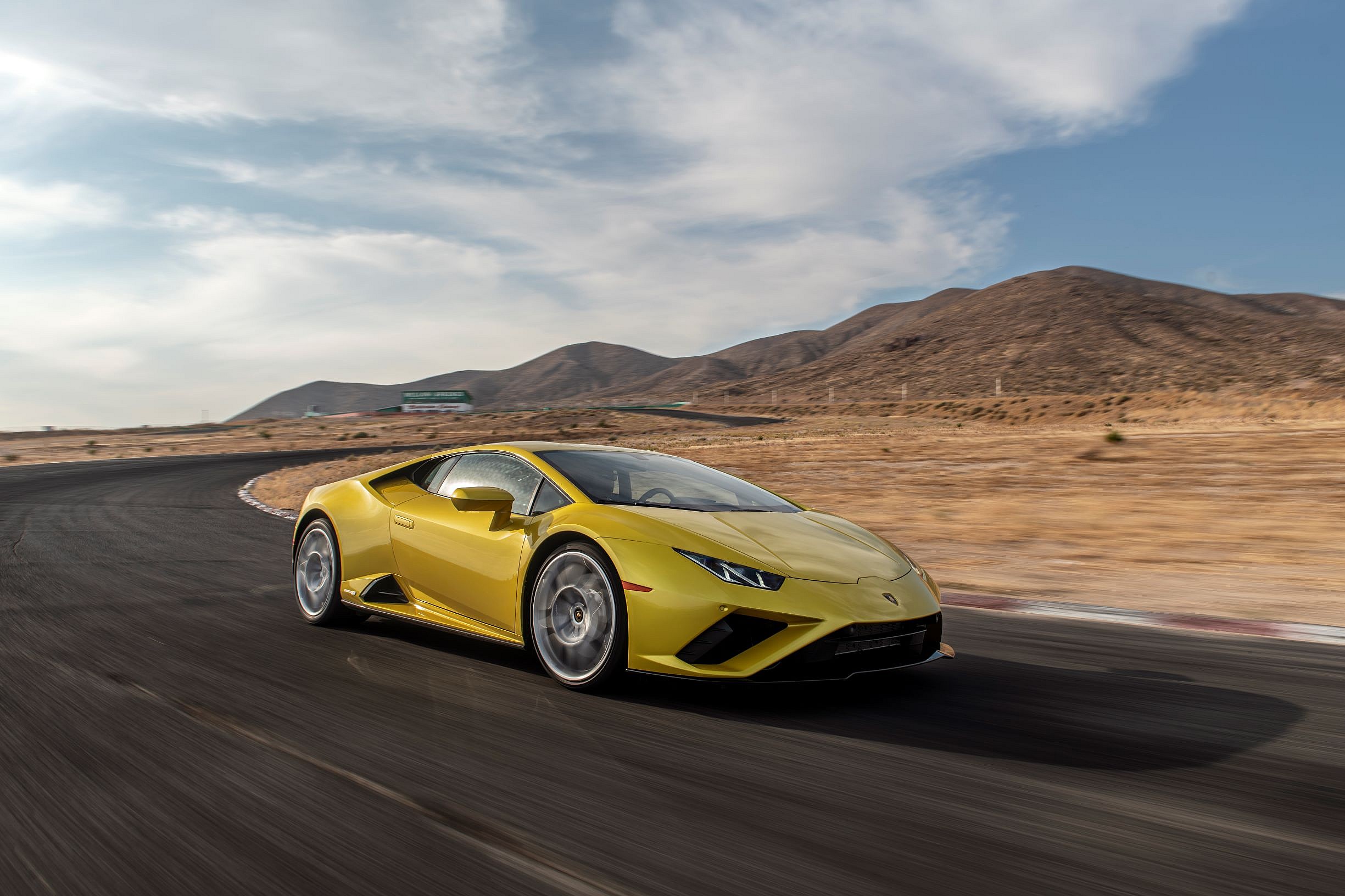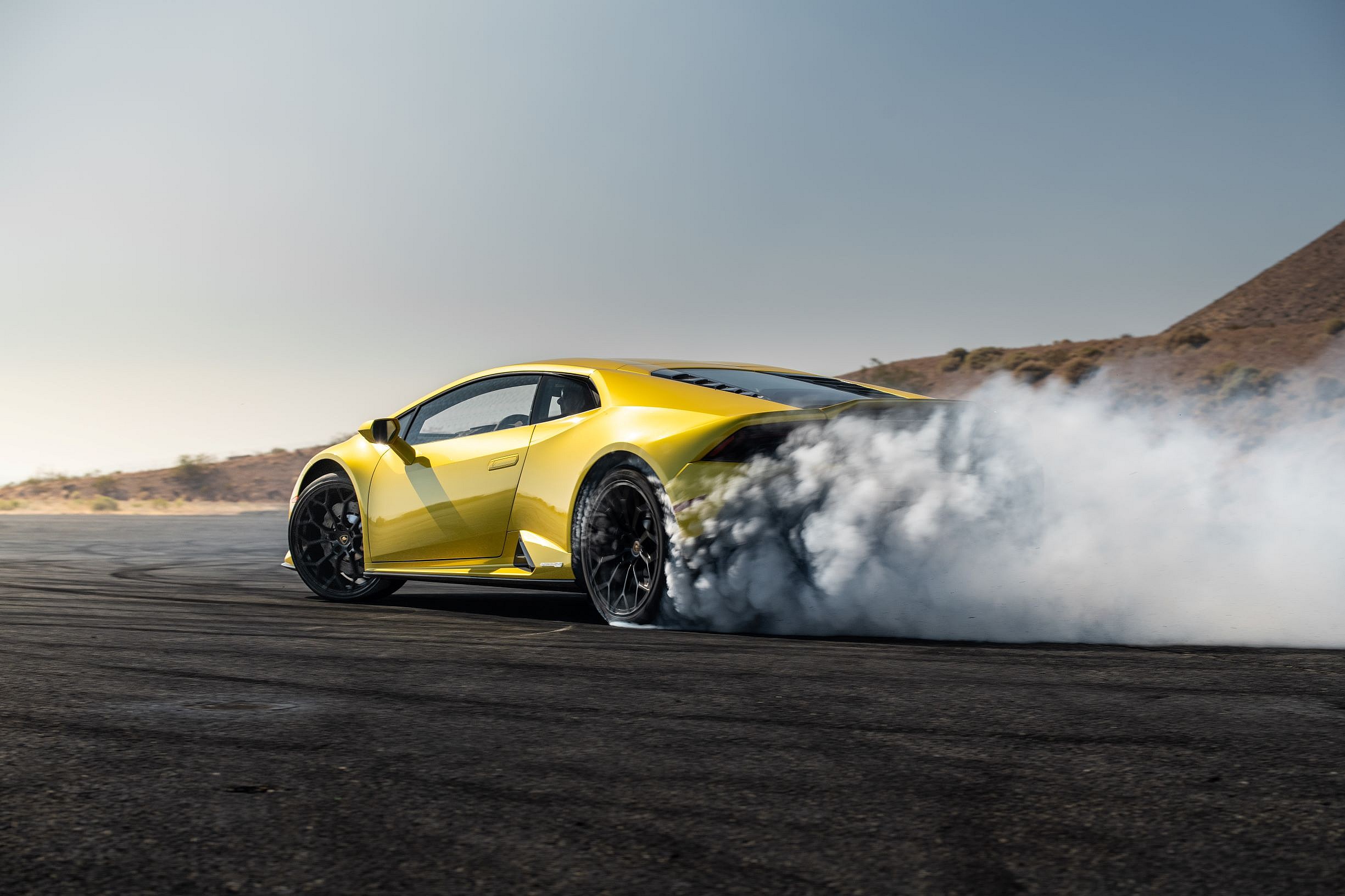 On the flawless black asphalt of the Bahrain International Circuit the EVO with AWD stuck to the corners with cyborg-like precision, but on Willow’s much spottier tarmac, and with only RWD, the job of keeping the Coupé in order is much more difficult. Although Lambo’s new Performance Traction Control System is specifically calibrated for the rear-wheel drive model there’s plenty of action to get loose, as the P-TCS still supplies torque even as the EVO goes sideways. In Sport mode the system allows a full 15-degrees of yaw, or spin, before kicking in to save your overcooked ass.