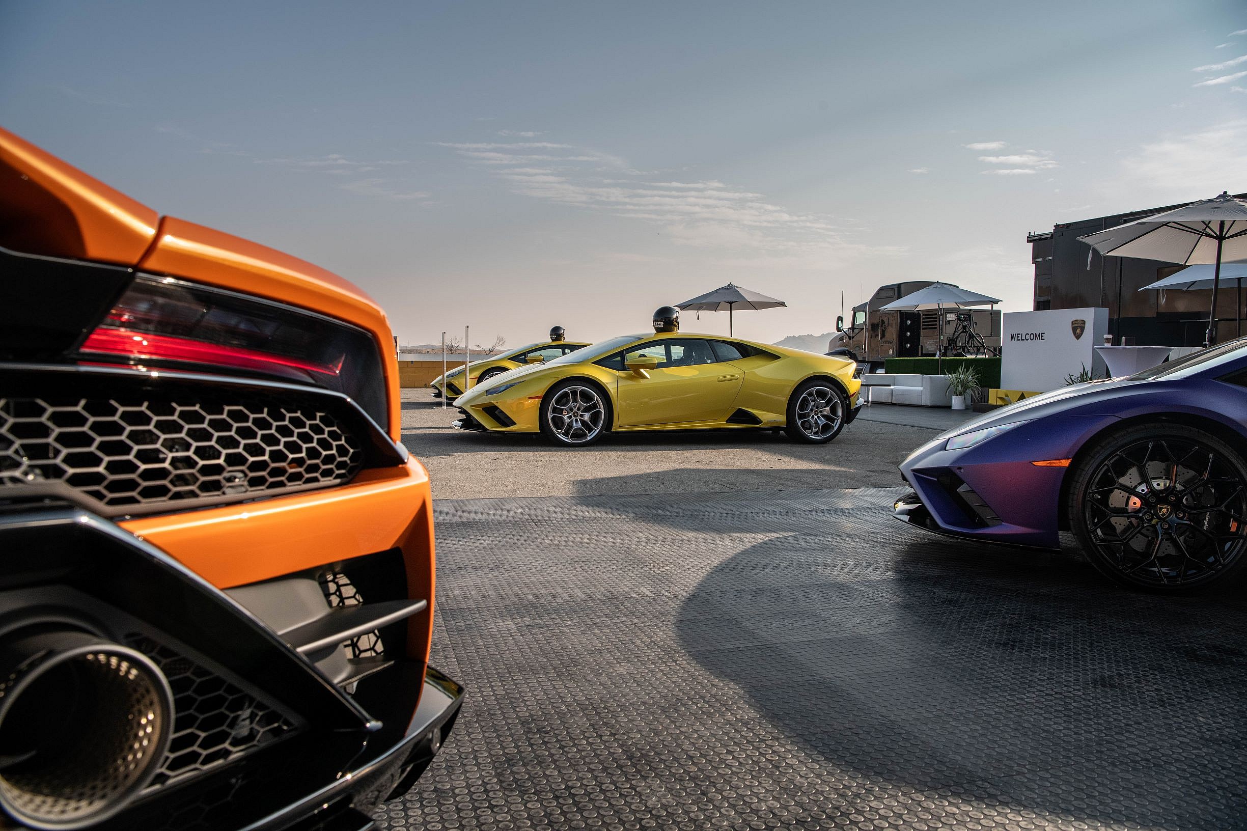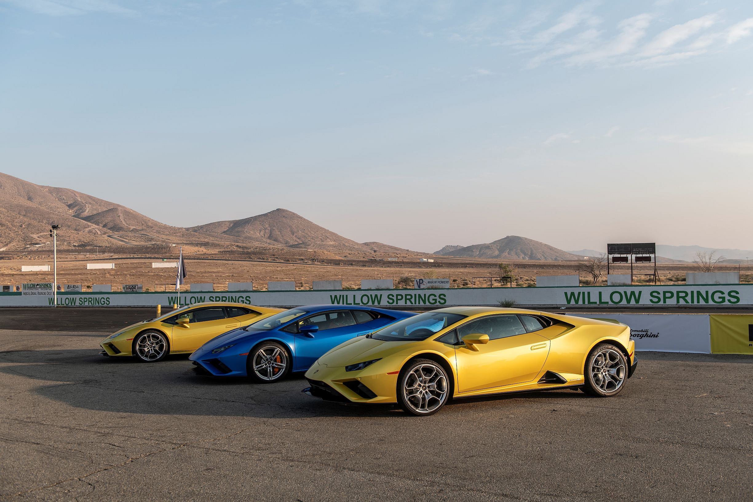 As we pull up to the main Big Willow course of the Willow Springs International Raceway, the first thing we see is a row of candy-colored Lamborghinis lined up next to a portable lounge the Italians have set up for our comfort. It’s our first “group” automotive launch since Covid came down on the planet, so no one really knows exactly how to behave — all we know is we’re offered the opportunity to be the first to drive the rear-wheel-drive (RWD) version of Lambo’s spectacular Huracán EVO supercar. We’ll risk anything for that.
