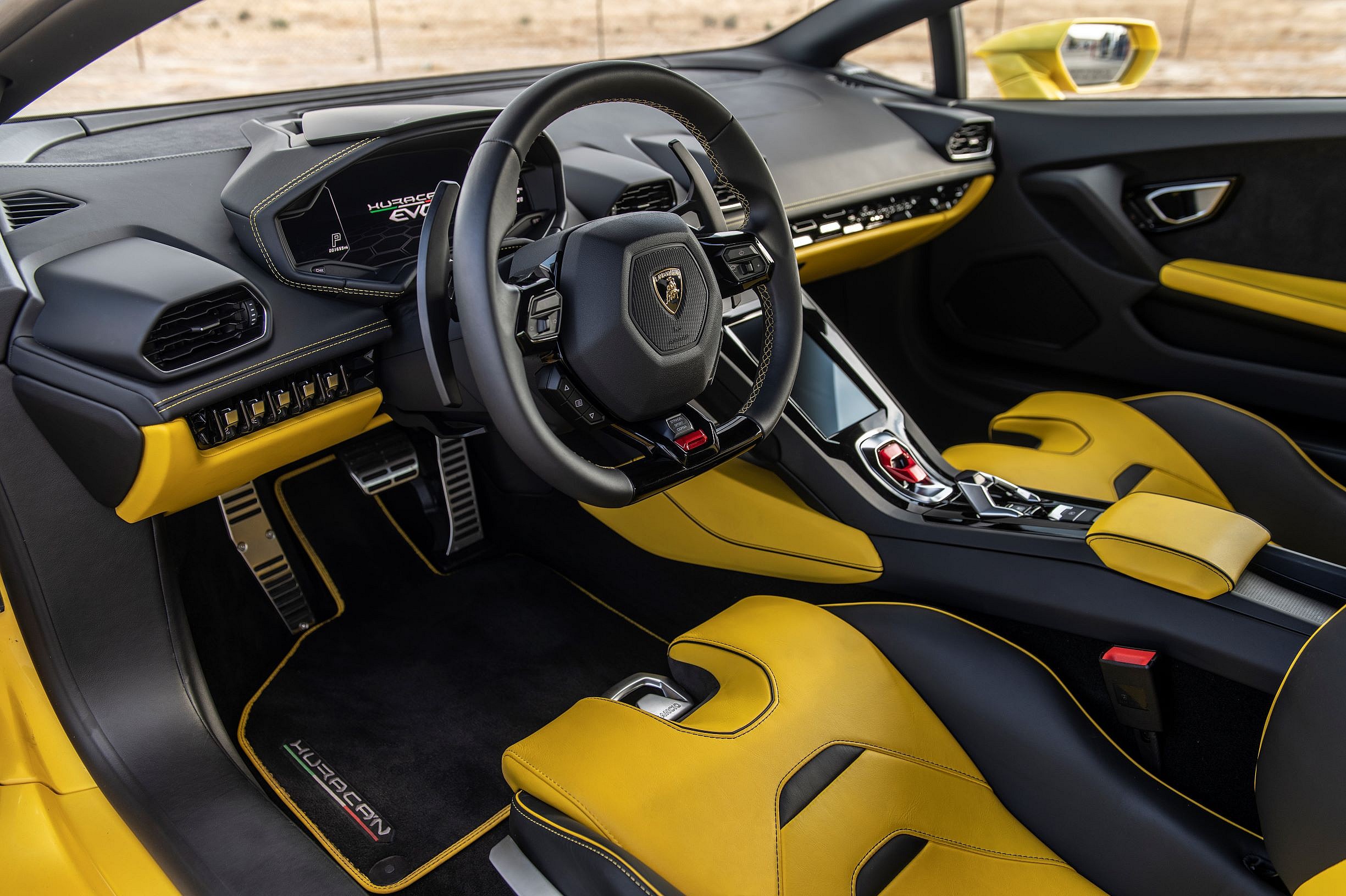 As we slip inside the black and banana-yellow Alcantara-wrapped womb of the Lambo any nervousness about a launch are quickly replaced by a swarm of butterflies going mental in my belly. Last time I drove the EVO Coupé was almost two years ago in Bahrain, on the distant middle eastern island nation’s Formula One racecourse. We hit 170-mph plus on the straights of the Bahrain International Circuit as a Super Blood Wolf Moon hung in the sky like a giant spotlight; it will be tough for anything to compare.