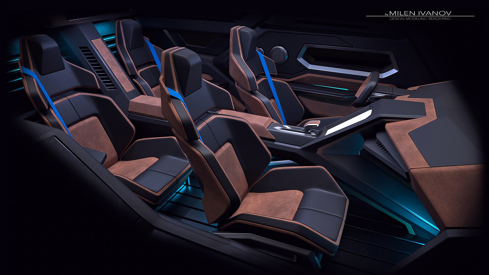 The interior mirrors the exterior’s angled lines and coloring, with tan, and black materials on the seats, dash and doors, as well as bright blue seatbelts and cabin lights.