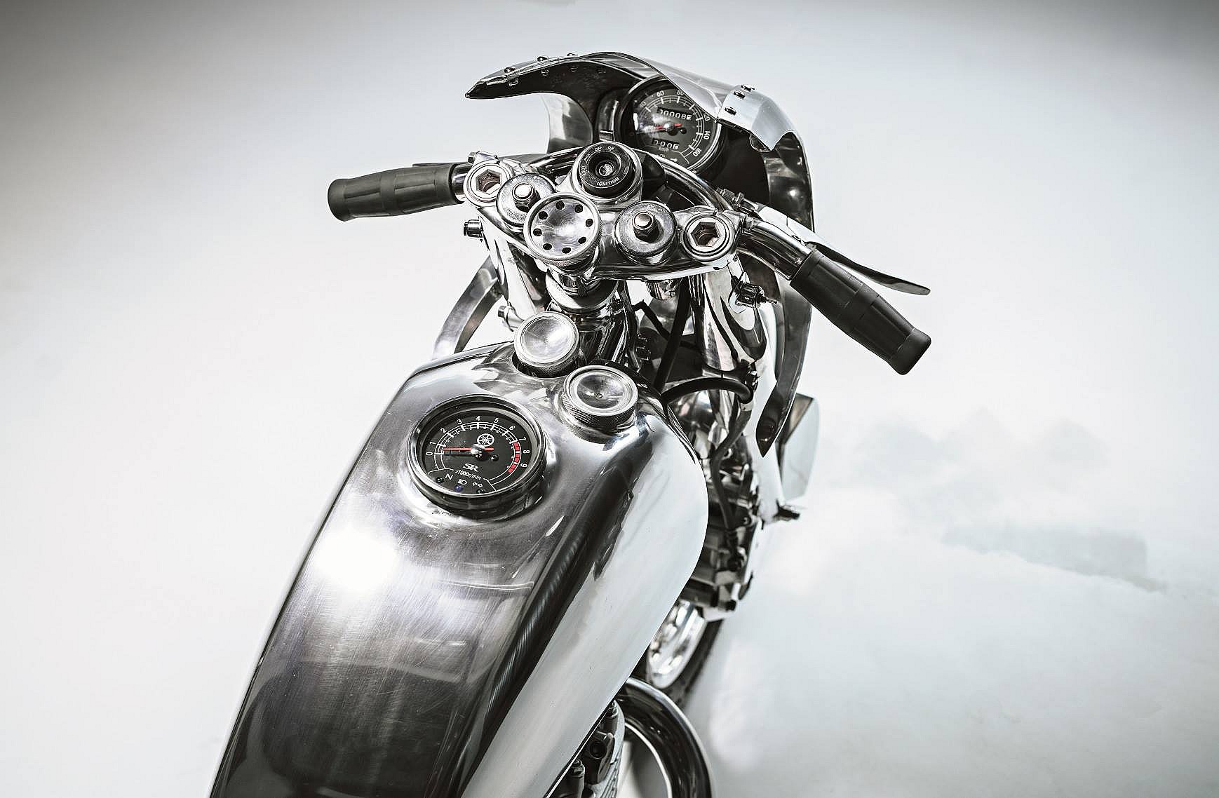 Check out the aluminum gas tank: it is hammered into a teardrop shape to enhance the bike’s art deco design theme. The scalloped shaped front fairing is also made of aluminum and mounts directly to the frame.