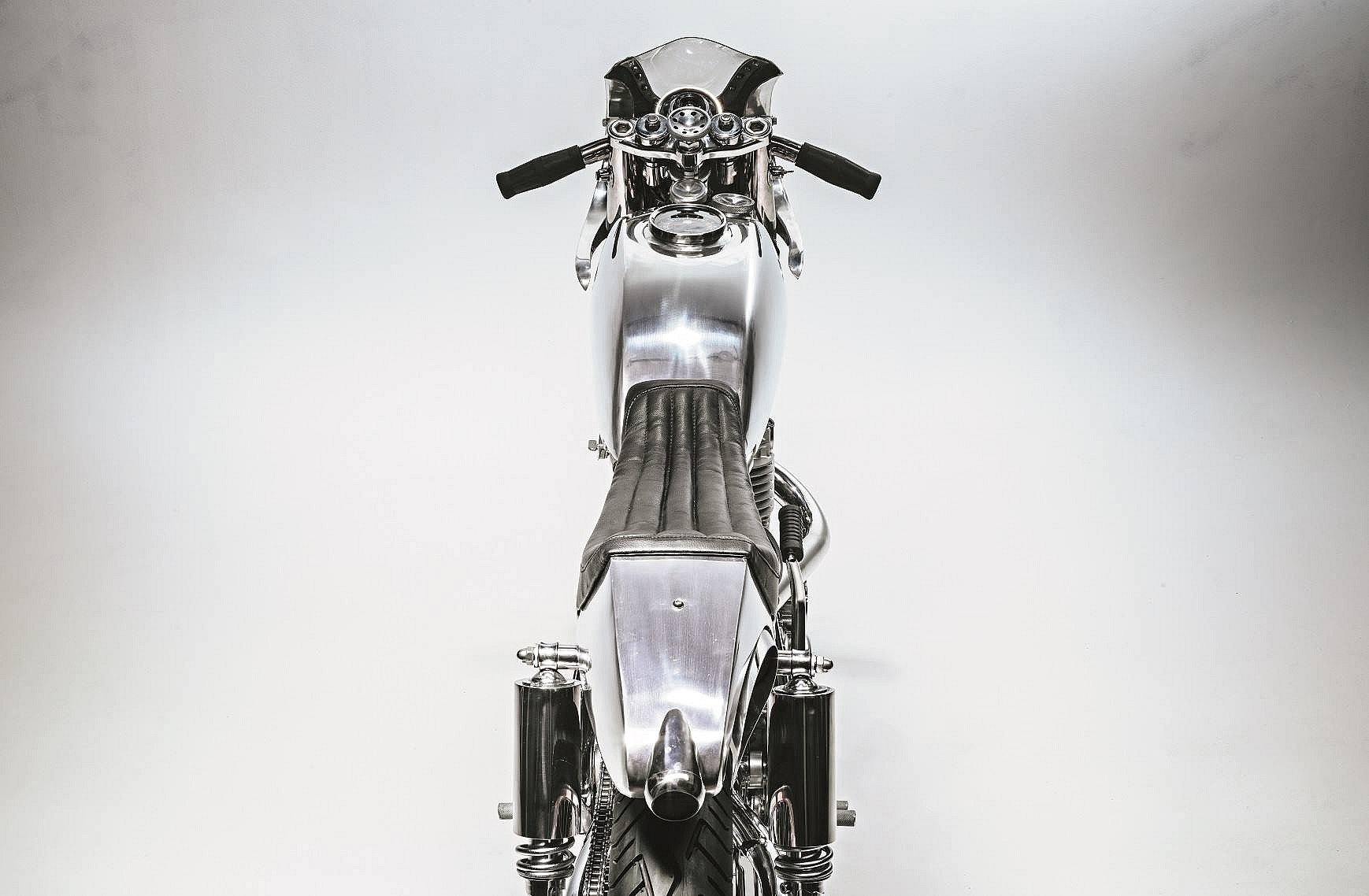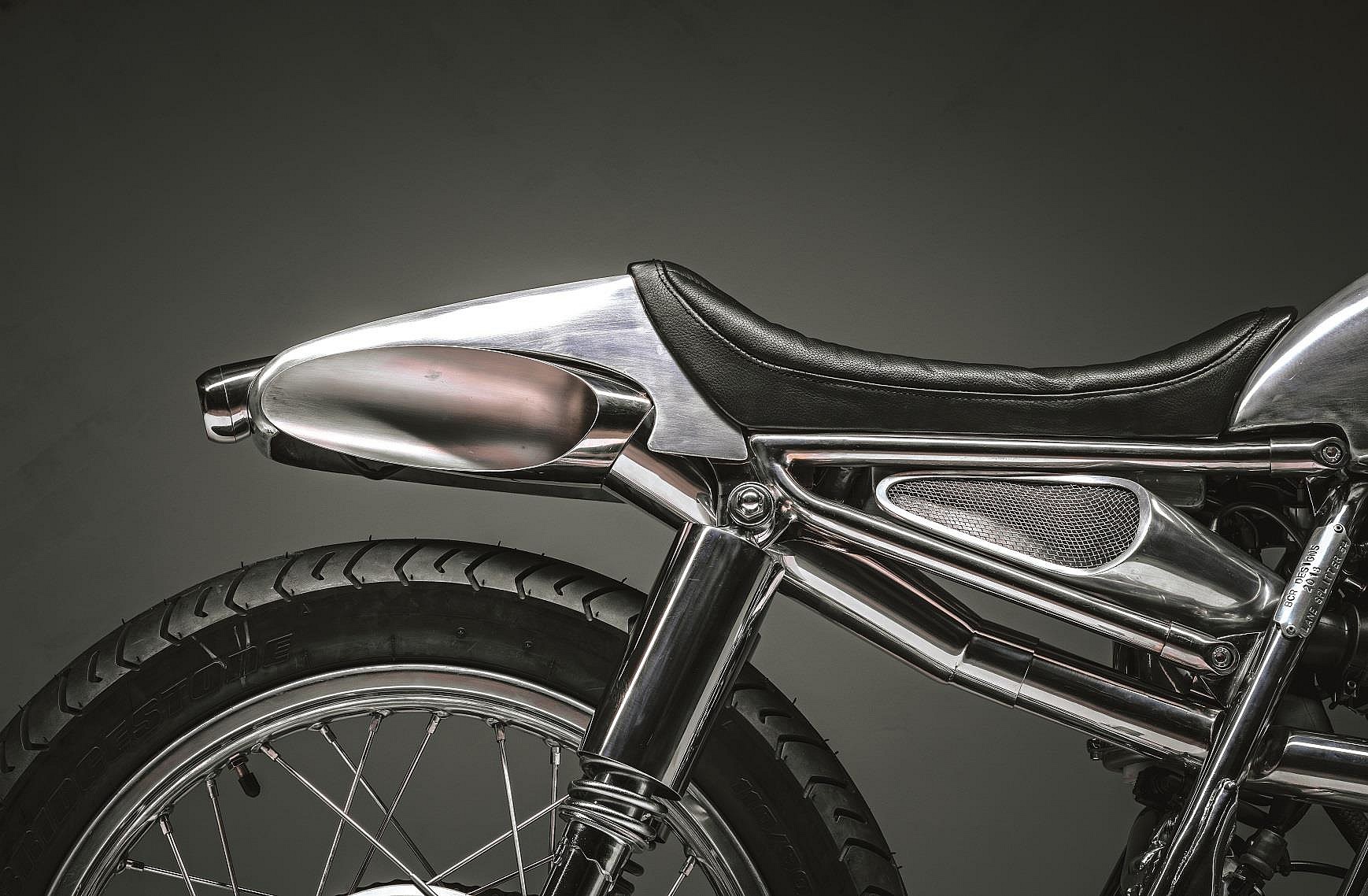 The bike’s hips were the starting point, so to convert it to runway model-thin, BCR Design cut away the rear subframe that supports the seat and replaced it with a narrower bolt-on stainless steel frame topped with a custom leather seat.