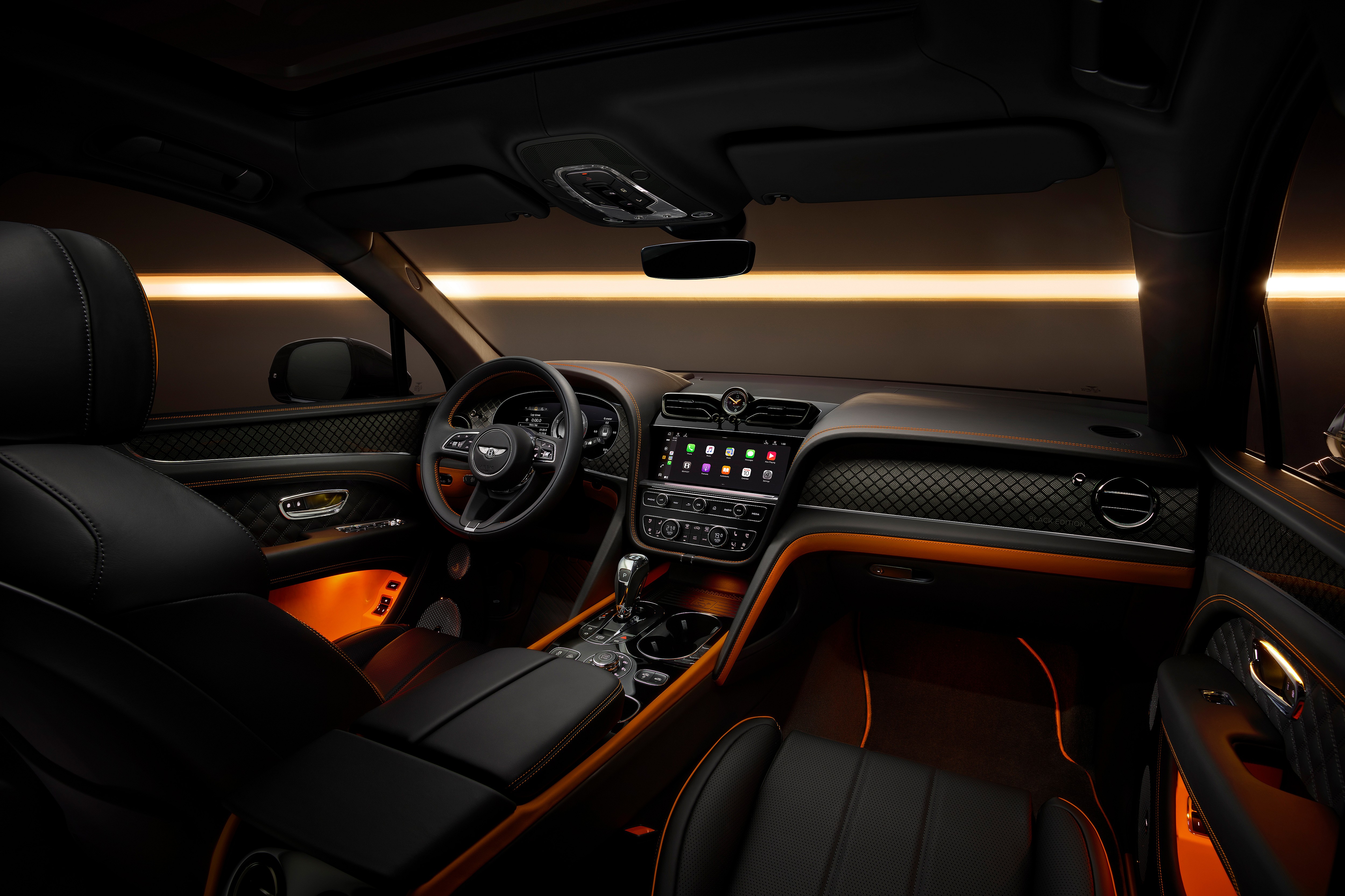 The Bentayga’s exterior boasts 22-inch black-painted wheels, dark-tint headlamps and a bold design aesthetic befitting, say, Bruce Wayne in his off-duty hours.