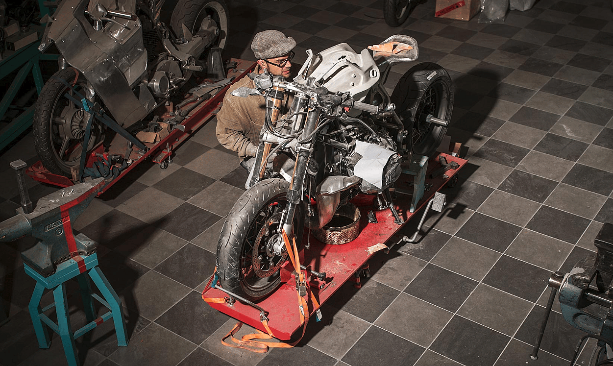 Apart from the handlebars, handbrakes and upside-down fork, everything was crafted by the Tin Man. The frame, tank, and exhaust and are all one-of-a-kind and the blacked-out wheels have been modified for sleeker styling.