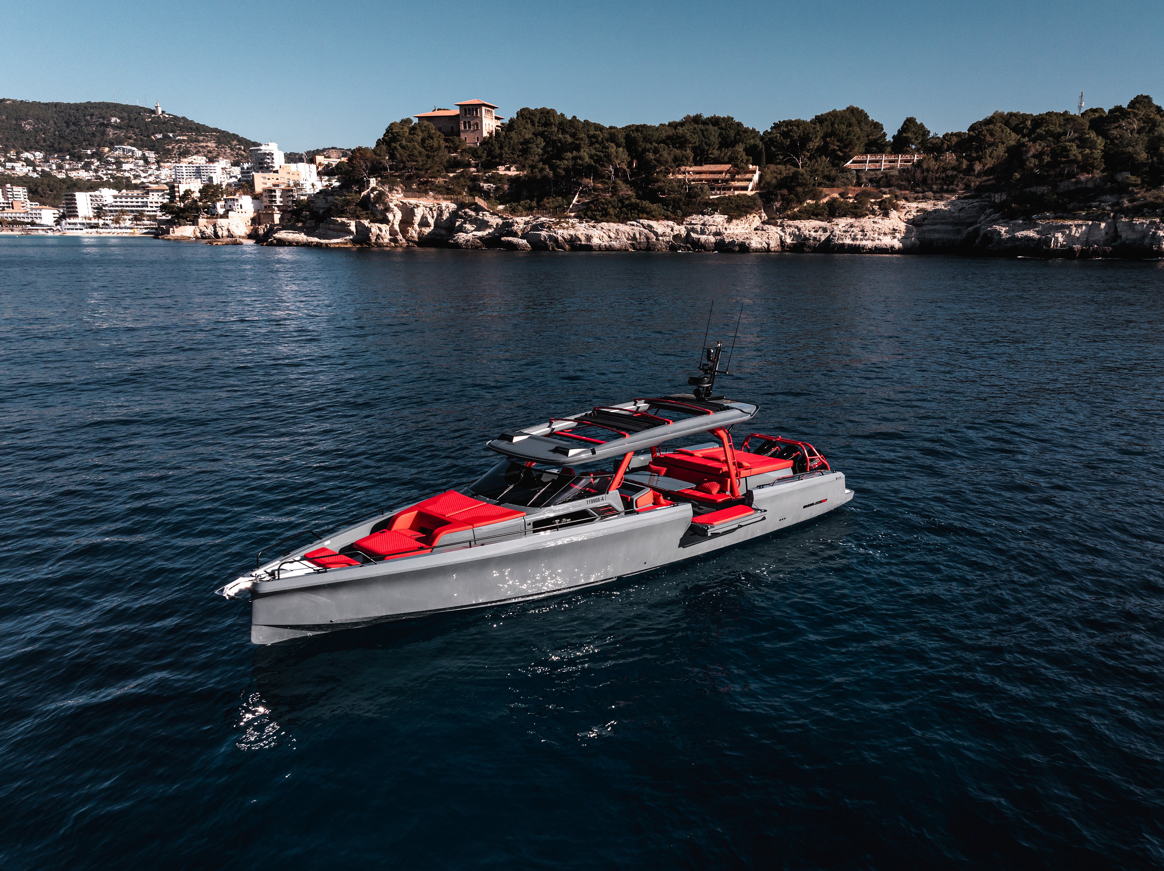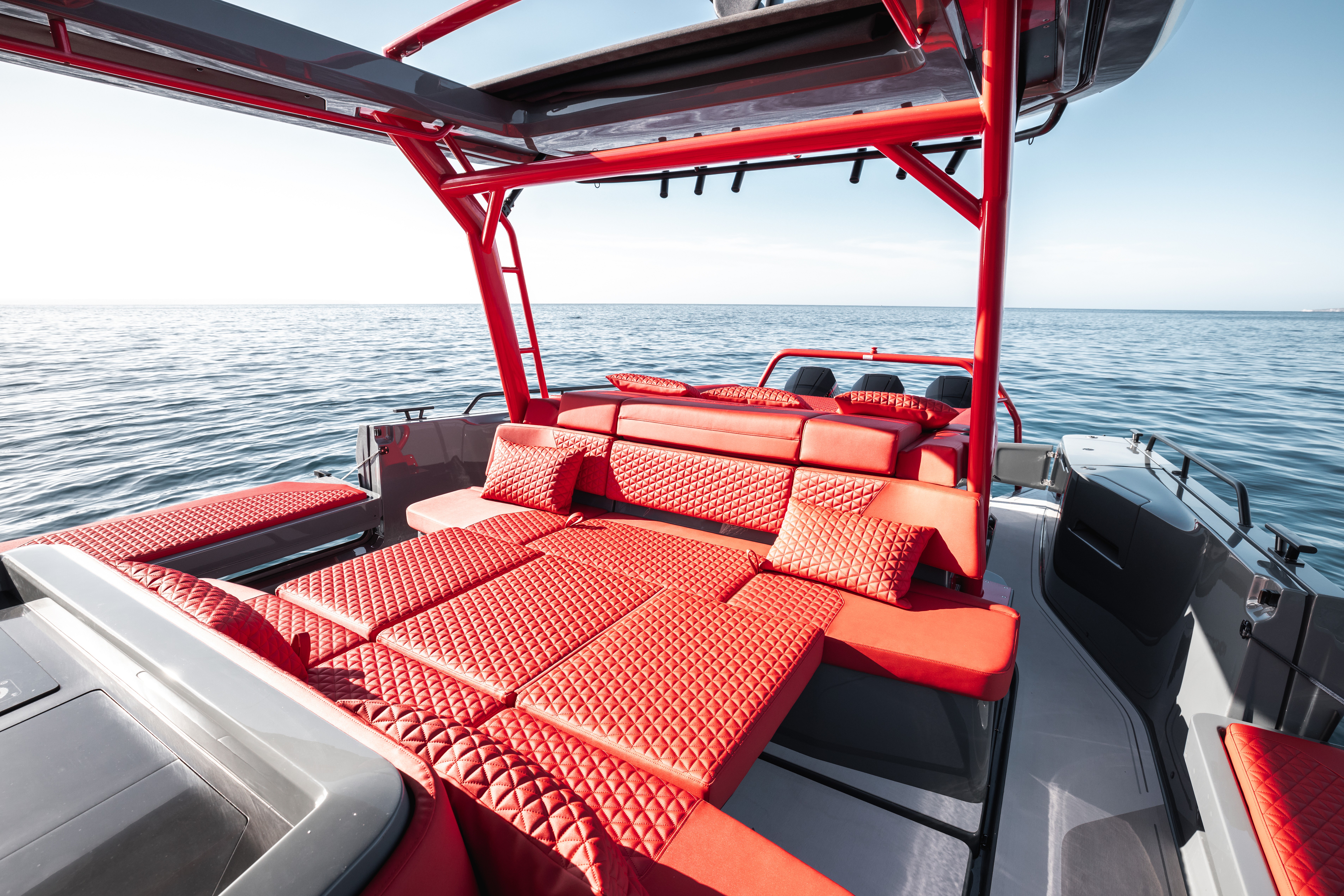 In accordance with its “Grand Tourer of the world’s oceans” billing, the boat features five massive social spaces onboard: the foredeck, helm, cockpit, including the balcony doors, aft deck, and the front lounge with the gullwing doors. An extra-wide sociable sofa wraps around the electric grill-equipped cockpit wetbar, and there’s an option for a u-sofa or aft cabin on the aft deck.