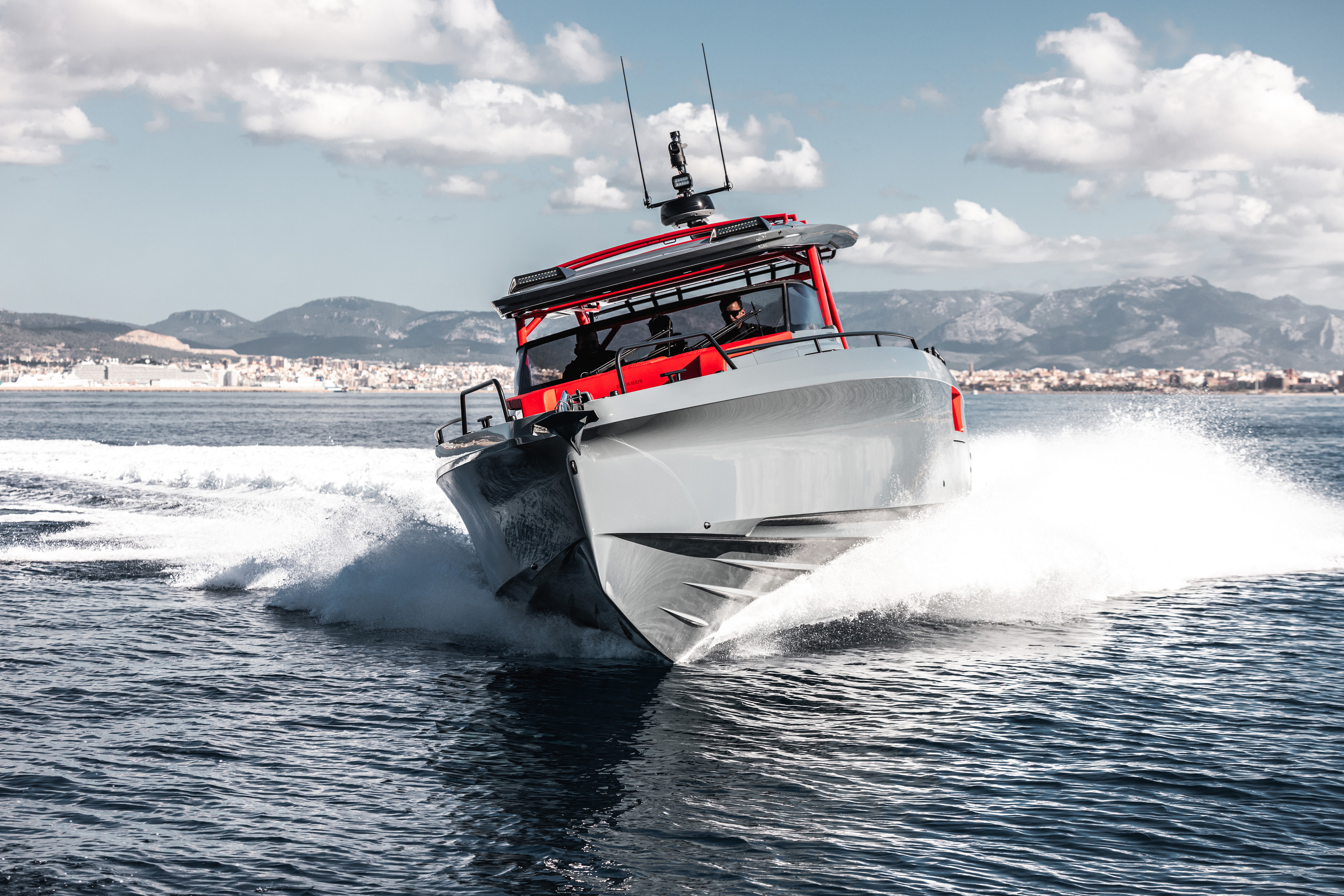Measuring just over 45 feet long and 13 feet wide, this beast packs 1,200 horsepower developed in three Mercury Racing 5.7-liter V10 engines. That translates to a top speed is 55 knots, or just over 62 mph, which Axopar says is “unmatched” at this 45-foot length.