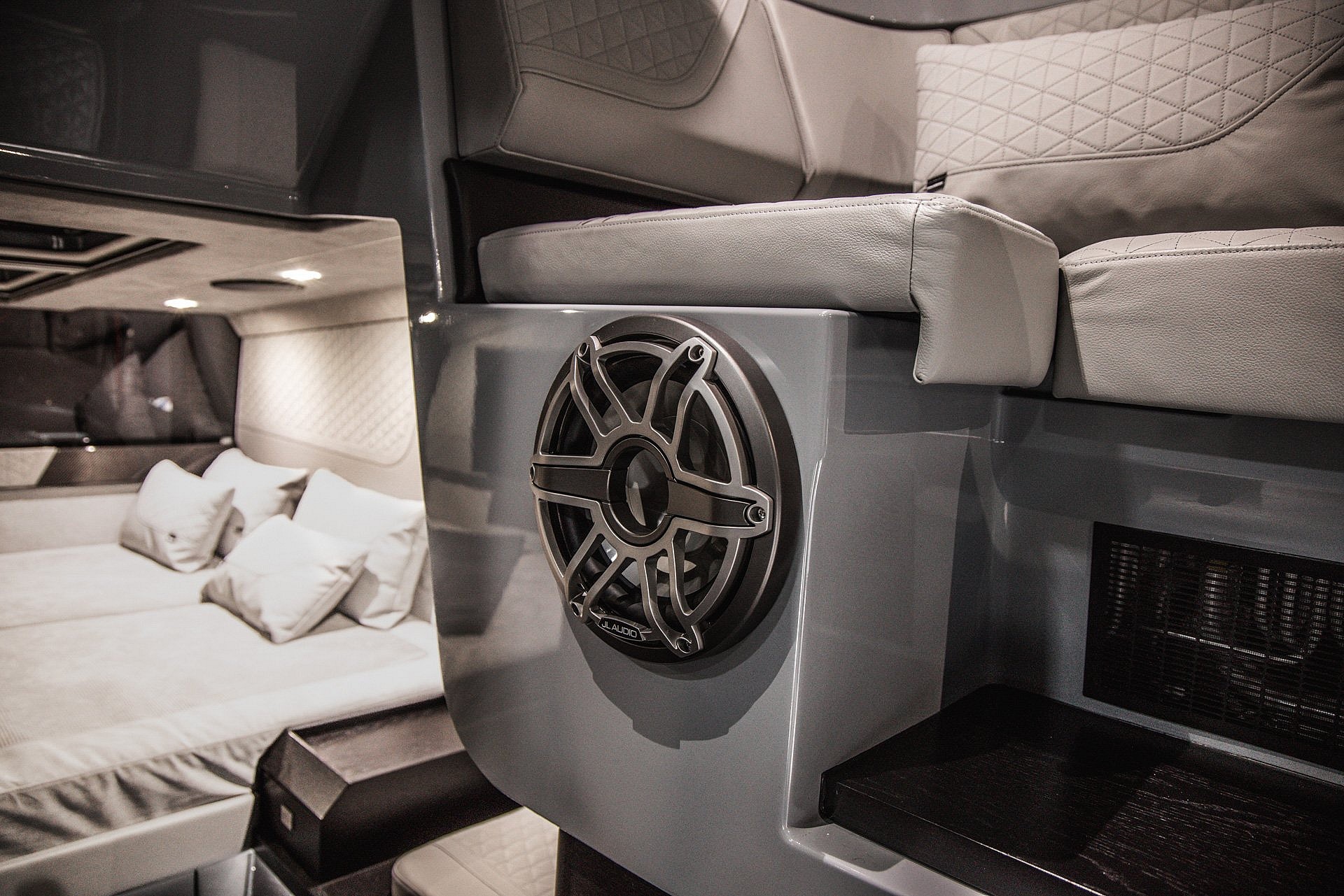 Other luxe amenities include a JL Audio system; dimmable LED, underwater and deck lighting, optional RGB lighting, dual electric sunroofs, and an infotainment media wall for the aft cabin.