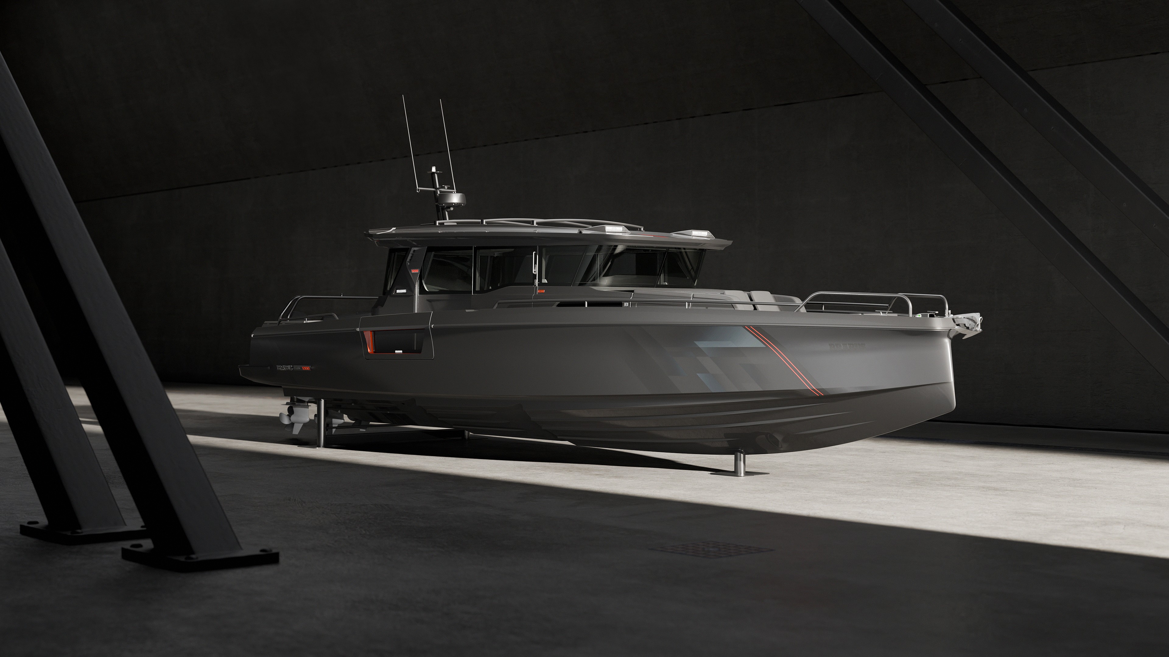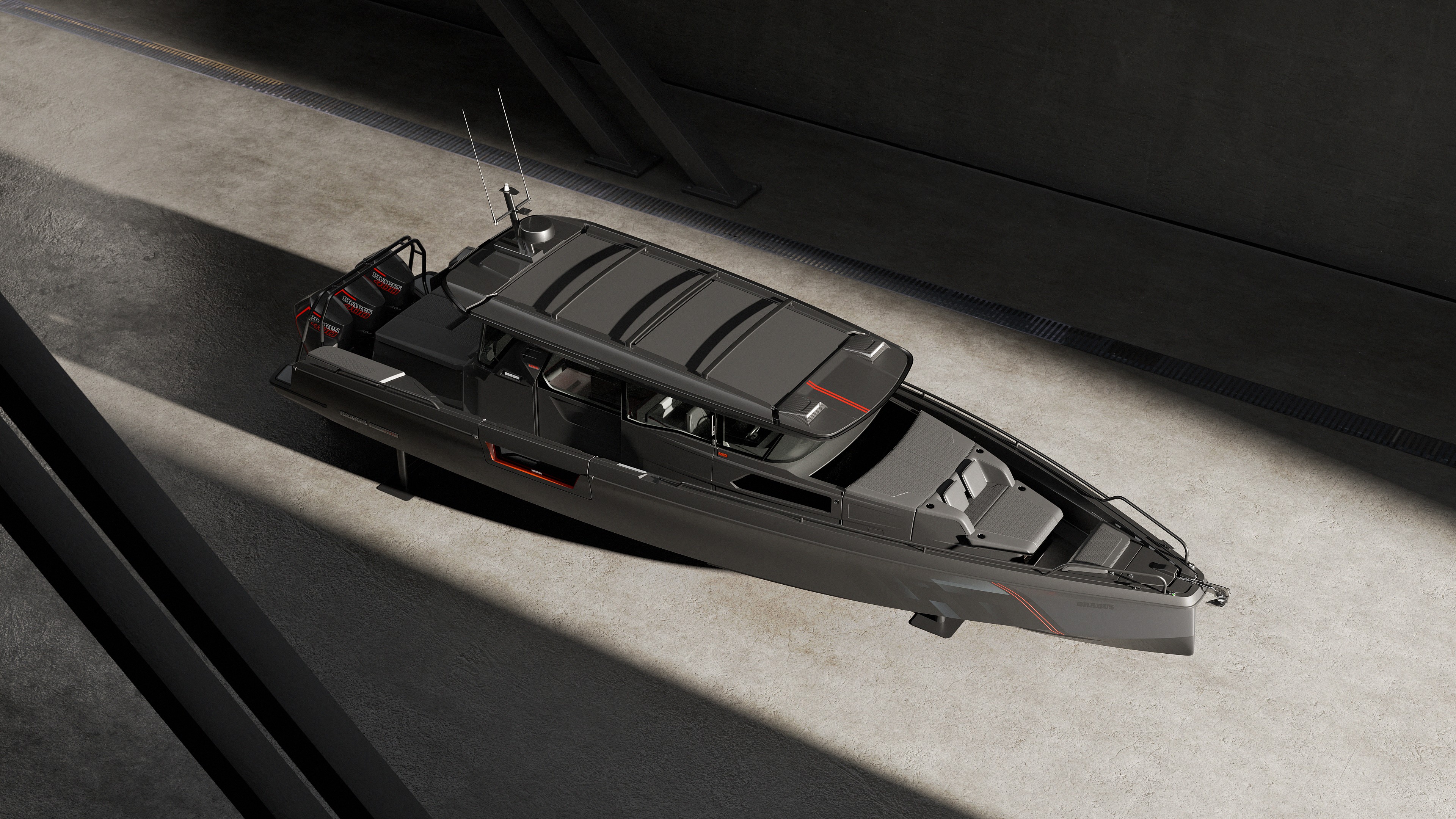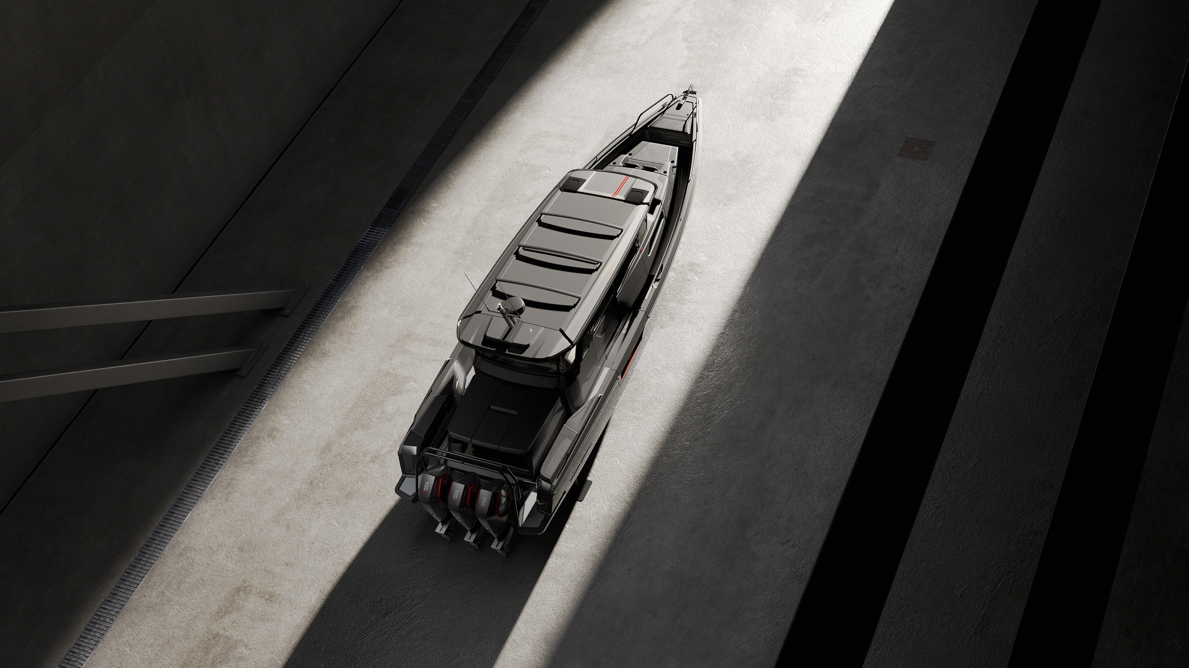 The boat itself boasts the same black-and-gray Black Ops Signature Edition scheme we’ve seen on the Shadow 900, featuring a “BRABUS Graphite Black” paint job and Signature Style graphics that run across the entire exterior design concept, and accompanying black chrome hull badges.