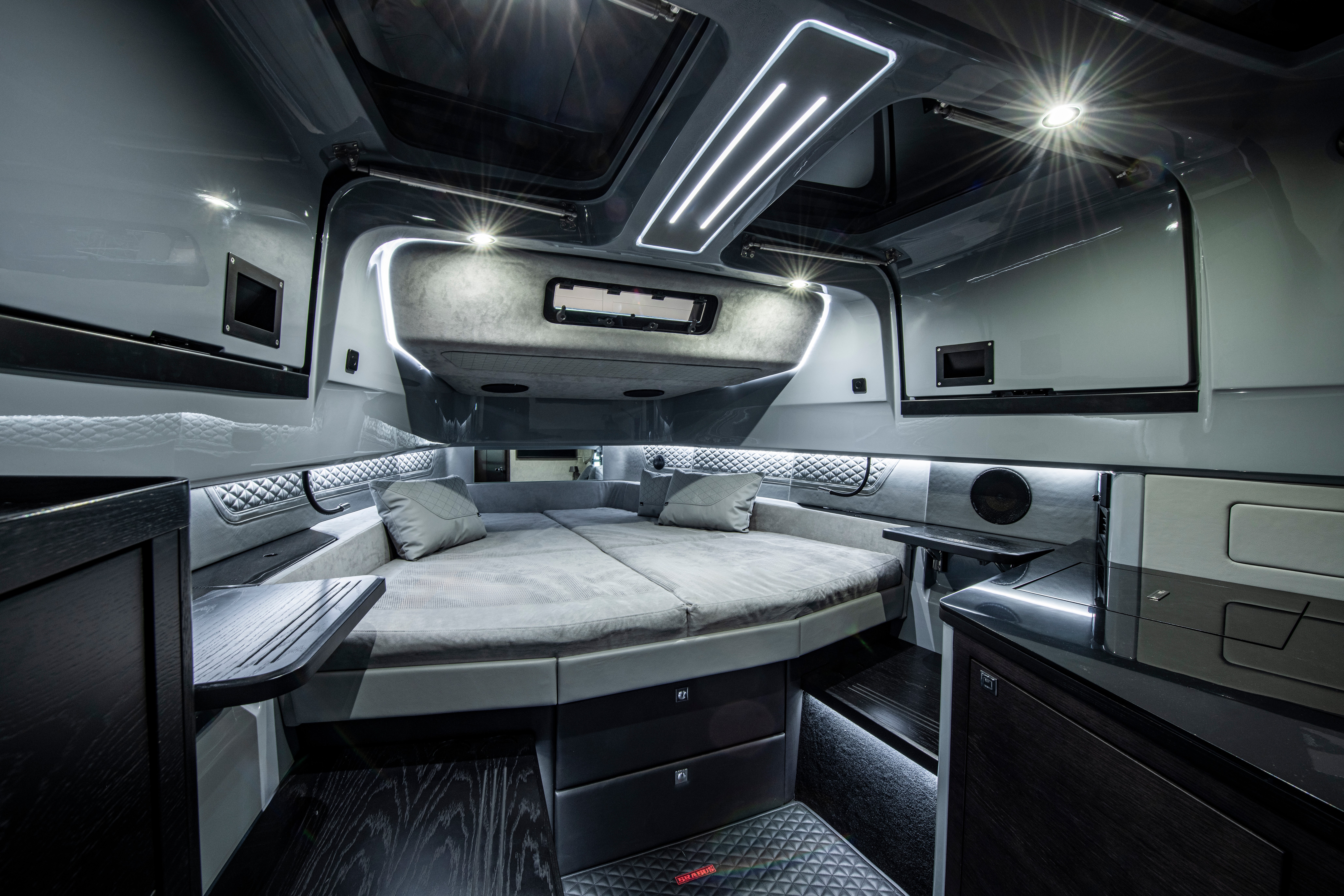 But Brabus also bills the Shadow 1200 as the “Grand Tourer of the world’s oceans.” Accordingly, the fully enclosed cruiser features five massive social spaces onboard: the foredeck, helm, cockpit, including the balcony doors, aft deck, and the front lounge with the gullwing doors. An extra-wide sociable sofa wraps around the electric grill-equipped cockpit wetbar, and there’s an option for a u-sofa or aft cabin on the aft deck. Brabus quilted upholstery is used throughout the main cabin and front lounge—clients can choose colors including “Graphite,” “Sunrise,” “Merlot” “Platinum,” and “Ice.