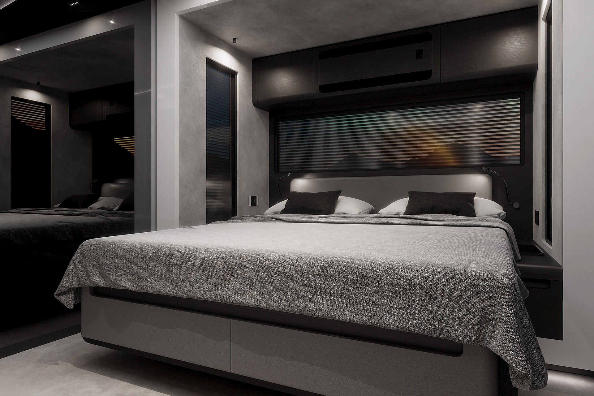 It boasts more than 300 square feet of living space across a sleek, blacked-out interior: If you’re into the looks of the recently launched Brabus Rocket GTS, for instance, this might be the motorhome upgrade for you. Boasting a bedroom and living space, plus a bathroom straight out of a modern luxury hotel, the rig travels just about anywhere thanks to hydraulically extendable supports that level it out on (nearly) any surface. A bed above the cockpit furthers its usability across the country.