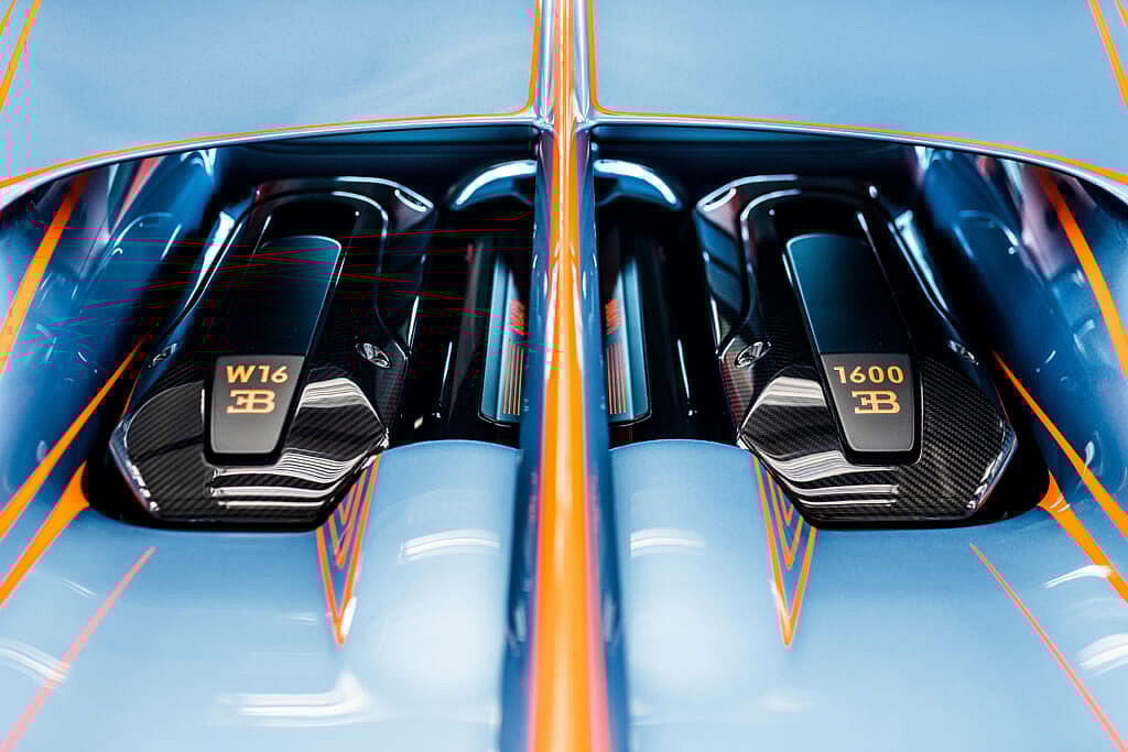 The famous 8.0-liter quad turbocharged W16 engine gets an upgraded cylinder head, oil pump, and turbochargers to achieve 1,577 hp, besting the Chiron and Chiron Sport’s output of 1,479 hp.