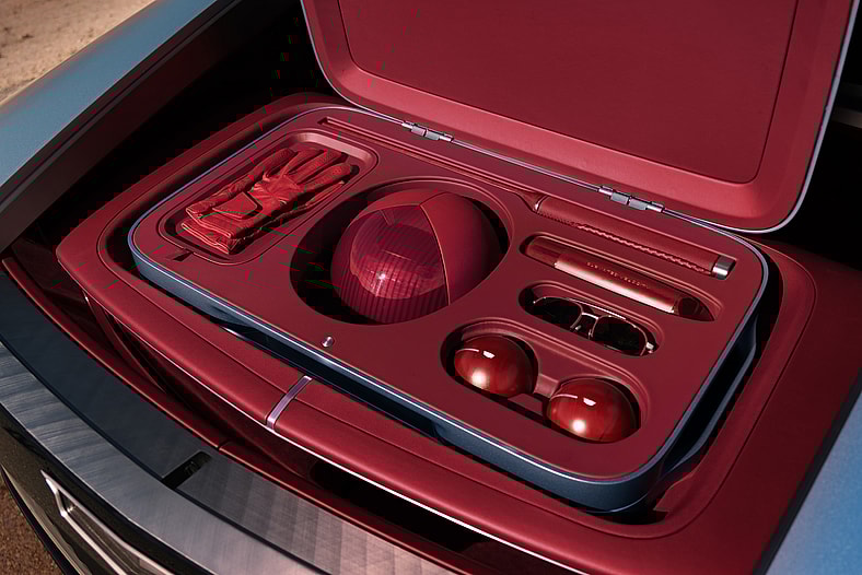 Deep red tones of the interior, from the Morello Red leather to the Garnet boucle fabric, aim to deliver a sense of energy and movement. The well-appointed cabin also includes a vault compartment for valuable items and a bespoke polo set in the rear. Its sleek profile is designed to be aerodynamically efficient while retaining the more dramatic proportions of a futuristic SUV. The Vapor Blue exterior, with undertones of flinty gray, draws inspiration from glacial ice and provides a striking contrast to the fiery red interior.