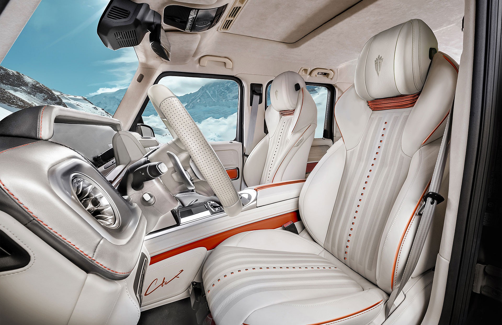 The body has also been raised by 10 cm and widened by 4 cm on each side, and the interior is clad largely in white Nappa leather with orange accents, inversing the exterior’s scheme. Not many other details were given on the Fiamma specifically, other than it was vaguely designed to “shine both on the ski slopes in the morning and under the opera house lights in the evening.”