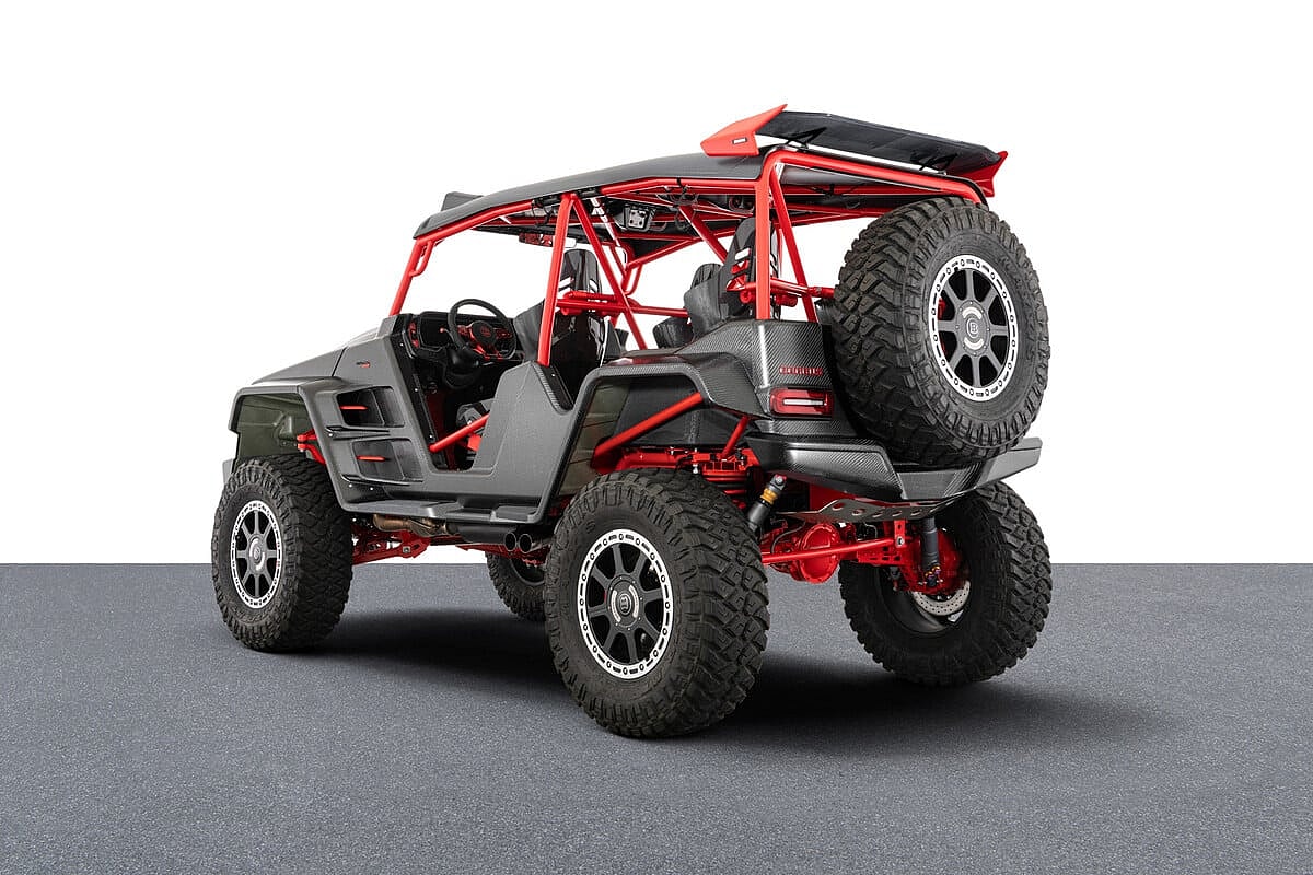 Thanks largely to the oversized powerplant, the 900 Crawler is a heavyweight dune buggy that tips the scales at 4,550 pounds without gas in the tank. But that’s not for a lack of weight saving measures—it has no windshield or doors, and the scooped hood, roof, fenders, side skirts, and spoiler are all made out of carbon fiber.