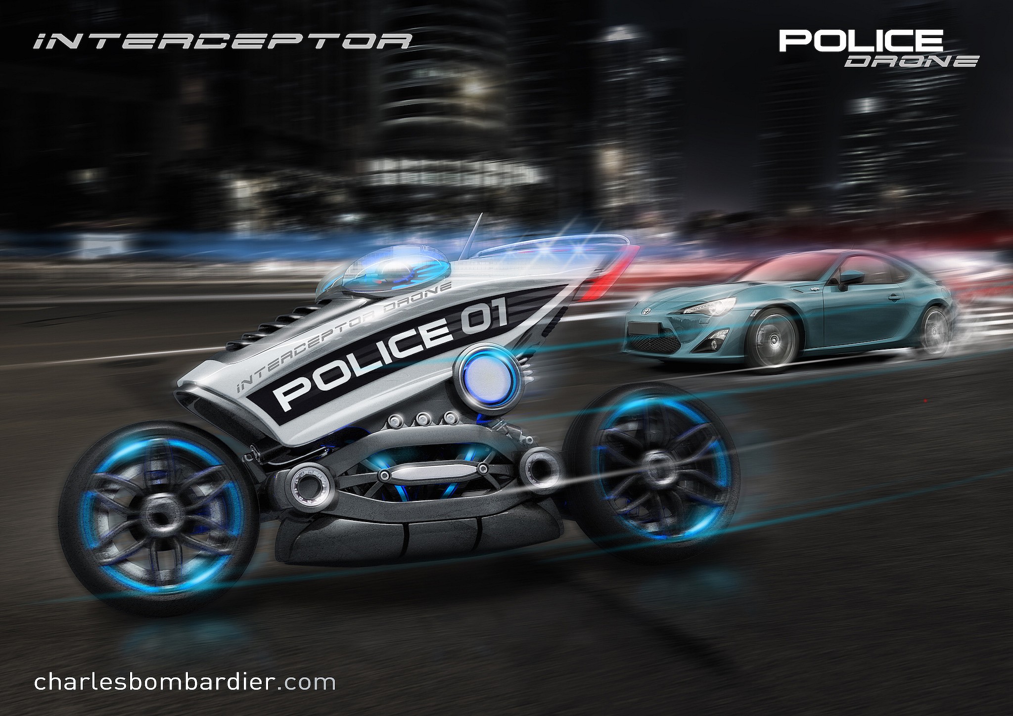 With no pesky officer aboard, its 24-horsepower electric motor provides the Interceptor sufficient motivation as it cruises while reading license plates and watching for flagrant offenses. A gyroscope keeps it balanced, even while stopped.