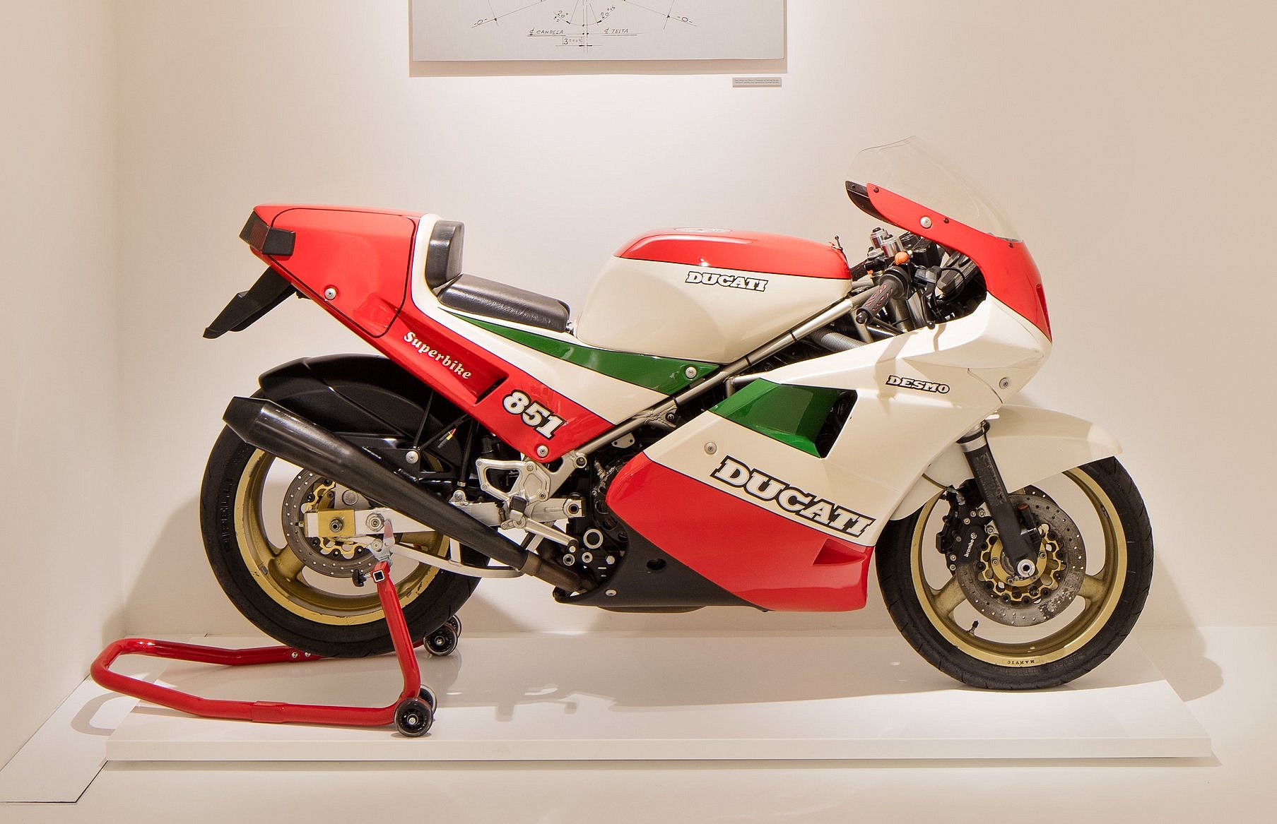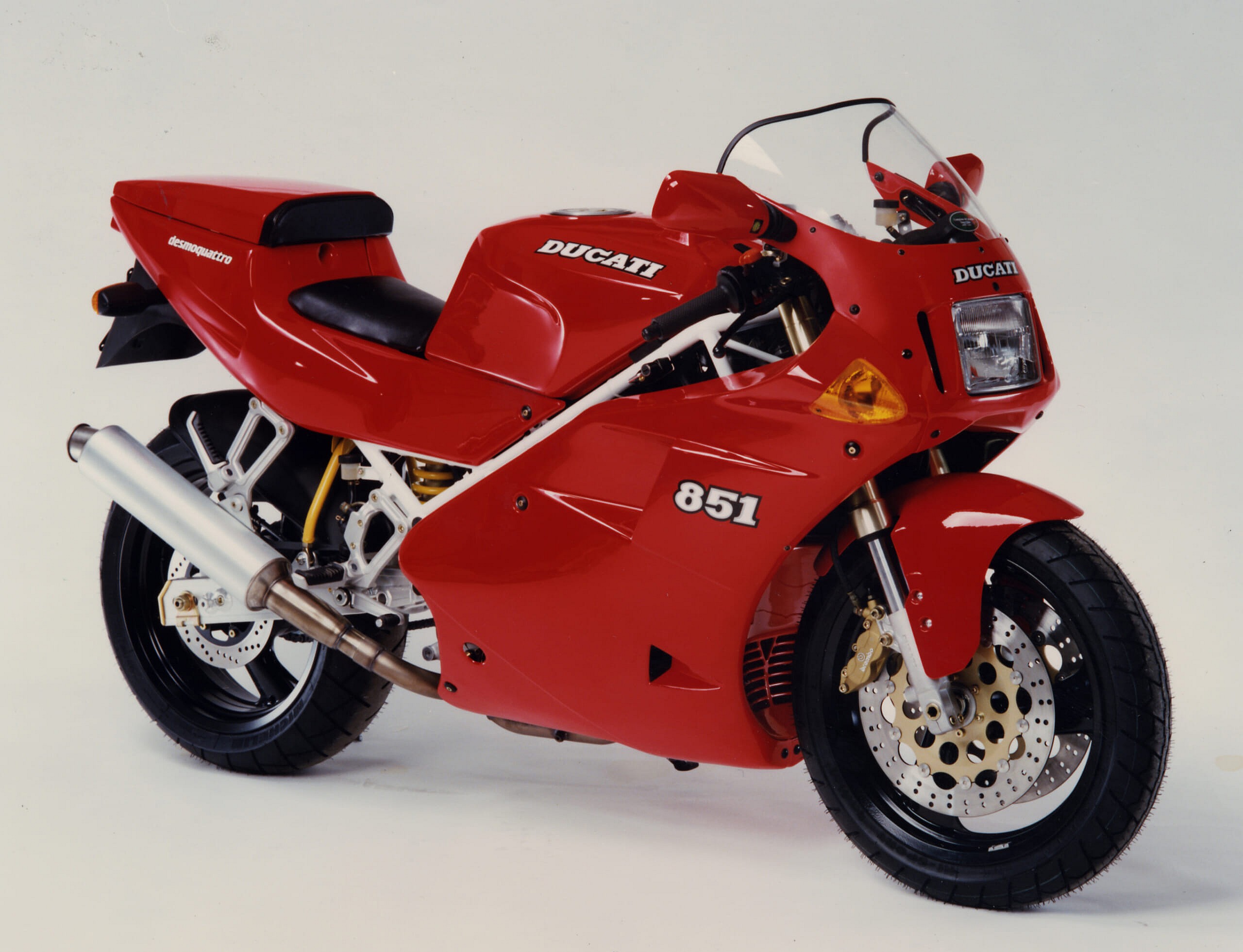 Ducati launched its family of V-twin superbikes with the seminal race-ready 851 of 1988. Factory rider Marco Lucchinelli’s scored Ducati’s first victory with the 851 at Donington Park, England in April of 1988, establishing a run of success that extended through the subsequent 888, 916, 996, 998 and 999 models.